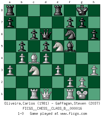 Last move : 1-0 2007 June 4 6:15:48 [Event "FICGS__CHESS__CLASS_B__000016"] [Site "FICGS"] [Date "2007.02.13"] [Round "1"] [White "Oliveira,Carlos"] [Black "Gaffagan,Steven"] [Result "1-0"] [WhiteElo "1981"] [BlackElo "2037"] 1.d4 d5 2.c4 e6 3.cxd5 exd5 4.Nc3 c6 5.Bf4 Bd6 6.Bxd6 Qxd6 7.e3 Bf5 8.Nf3 Nf6 9.Be2 Nbd7 10.O-O O-O 11.Rc1 Rfe8 12.a3 h6 13.b4 b5 14.h3 Nb6 15.Ne5 Nc4 16.Bxc4 1-0 This chess game has been lost on time (started : 2007.02.13 12:59:1) Queen's gambit declined Kingside Castling by player White (move 10) Kingside Castling by player Black (move 10) Player White won this chess game. Follow this game move after move (download)Live, lose, and learn, by observing your opponent how to win. (Amber Steenbock) Wenn ich einen Club besuche, sind die Spieler stumm vor Staunen. (José Raúl Capablanca) Cuando le juegas a Fischer, no es una cuestion de si vas a ganar o perder. Es una cuestion de si vas a sobrevivir. (Boris Spassky) En blitz, le Cavalier l'emporte sur le Fou. (Vlastimil Hort) The best teachers teach from the heart, not from the book. (Author unknown)