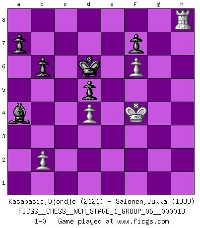 Last move : 1-0 2014 May 14 9:17:4 [Event "FICGS__CHESS__WCH_STAGE_1_GROUP_06__000013"] [Site "FICGS"] [Date "2014.03.03"] [Round "1"] [White "Kasabasic,Djordje"] [Black "Salonen,Jukka"] [Result "1-0"] [WhiteElo "2121"] [BlackElo "1939"] 1.d4 d5 2.Nf3 e6 3.c4 Nf6 4.Nc3 Be7 5.Bg5 O-O 6.e3 Nbd7 7.Rc1 h6 8.Bh4 b6 9.cxd5 exd5 10.Bd3 c5 11.O-O Bb7 12.Bf5 g6 13.Bxd7 Qxd7 14.Ne5 Qf5 15.f4 Rfe8 16.a4 Kg7 17.h3 h5 18.Bg5 Rac8 19.Ne2 Ne4 20.g4 hxg4 21.hxg4 Qe6 22.f5 gxf5 23.gxf5 Qd6 24.Bf4 Rg8 25.Ng3 Nxg3 26.Qg4+ Kf8 27.Nd7+ Ke8 28.Qxg8+ Kxd7 29.Qxg3 Qf6 30.Be5 Bd6 31.Bxf6 Bxg3 32.Kg2 Bd6 33.Kf3 Rf8 34.Rh1 Ba6 35.Be5 Be7 36.f6 Bd6 37.Bxd6 Kxd6 38.Rh5 cxd4 39.exd4 Bc8 40.Rch1 Bd7 41.Rh8 Rxh8 42.Rxh8 Bxa4 43.Kf4 1-0 Queen's pawn game Kingside Castling by player Black (move 5) Kingside Castling by player White (move 11) Player White won this chess game. Follow this game move after move (download)Tactics flow from a superior position. (Bobby Fischer) Schach ist gnadenlos. Du mußt bereit sein zu töten. (Nigel Short) Un Peón pasado aumenta su poder a medida de que el número de piezas en el tablero disminuye. (Capablanca) Il vaut toujours mieux jouer un plan faux de façon logique que de n'avoir pas de plan du tout. (Victor Kortchnoï) All maxims have their antagonist maxims; proverbs should be sold in pairs, a single one being but a half truth. (William Mathews)
