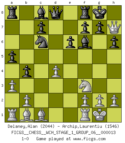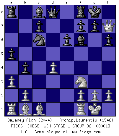 Last move : 1-0 2014 March 11 20:24:39 [Event "FICGS__CHESS__WCH_STAGE_1_GROUP_06__000013"] [Site "FICGS"] [Date "2014.03.03"] [Round "1"] [White "Delaney,Alan"] [Black "Archip,Laurentiu"] [Result "1-0"] [WhiteElo "2044"] [BlackElo "1546"] 1.d4 d5 2.c4 dxc4 3.e4 Nf6 4.e5 Nd5 5.Bxc4 e6 6.Nf3 Bb4+ 7.Nbd2 O-O 8.O-O Nc6 9.a3 Be7 10.Ne4 h6 11.Ba2 b5 12.Qd3 b4 13.Bb1 a5 14.Nf6+ Nxf6 15.exf6 Bxf6 16.Qh7+ 1-0 QGA : 3.e4 Kingside Castling by player Black (move 7) Kingside Castling by player White (move 8) Player White won this chess game. Follow this game move after move (download)Chess holds its master in its own bonds, shackling the mind and brain so that the inner freedom of the very strongest must suffer. (Albert Einstein) Die größte Kunst beim Schach besteht darin dem Gegner nicht zu zeigen was er tun kann. (Garry Kasparov) Si tu oponente no puede hacer nada activo, entonces no apures la posición; En vez de eso, dejalo estar sentado ahí, sufriendo y rogandote por un empate. (Jeremy Silman) Les pièces de l'échiquier étaient impitoyables. Elles le retenaient, elles l'absorbaient. Il y avait de l'horreur en cela, mais aussi une harmonie unique. Car, qu'y a-t-il dans le monde, à part les échecs ? (V. Nabokov) There is no instance of a country having benefited from prolonged warfare. (Sun Tzu)