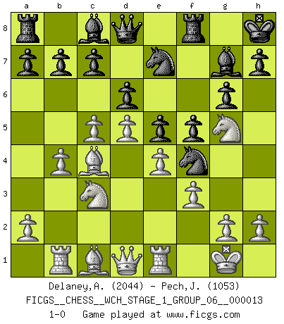 Last move : 1-0 2014 April 26 20:21:43 [Event "FICGS__CHESS__WCH_STAGE_1_GROUP_06__000013"] [Site "FICGS"] [Date "2014.03.03"] [Round "1"] [White "Delaney,Alan"] [Black "Pech,Jaroslav senior"] [Result "1-0"] [WhiteElo "2044"] [BlackElo "1053"] 1.d4 Nf6 2.c4 g6 3.Nc3 Bg7 4.e4 d6 5.Nf3 O-O 6.Be2 e5 7.O-O Nc6 8.d5 Ne7 9.b4 Nh5 10.Re1 f5 11.Ng5 Nf6 12.f3 Nh5 13.c5 Nf4 14.Bc4 Kh8 15.Rb1 1-0 This chess game has been lost on time (started : 2014.03.03 0:12:59) King's Indian : Orthodox, Aronin-Taimanov variation (Yugoslav attack / Mar del Plata variation) Kingside Castling by player Black (move 5) Kingside Castling by player White (move 7) Player White won this chess game. Follow this game move after move (download)It's just you and your opponent at the board and you're trying to prove something. (Bobby Fischer) Darum geht es im Schach. Einen Tag gibst du deinem Gegner eine Lektion, am nächsten Tag gibt er dir eine. (Robert James Fischer) El Ajedrez detiene a su maestro dentro de sus propios vínculos, encadenando la mente y el cerebro, por lo que la libertad interior del mas fuerte debe sufrir. (Albert Einstein) Le moment que je préfère le plus dans une rencontre, c'est celui où je sens que la personnalité de l'adversaire se brise. (Robert Fischer) A government big enough to give you everything you want is strong enough to take everything you have. (Thomas Jefferson)