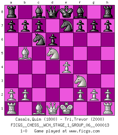 Last move : 1-0 2014 April 20 8:9:53 [Event "FICGS__CHESS__WCH_STAGE_1_GROUP_06__000013"] [Site "FICGS"] [Date "2014.03.03"] [Round "1"] [White "Casals,Quim"] [Black "Tri,Trevor"] [Result "1-0"] [WhiteElo "1800"] [BlackElo "2000"] 1.e4 e5 2.Nf3 Nc6 3.d4 exd4 4.c3 dxc3 5.Nxc3 d6 6.Bb5 Nge7 7.Nd5 1-0 This chess game has been lost on time (started : 2014.03.03 0:12:59) Scotch : Goering gambit Player White won this chess game. Follow this game move after move (download)Some sacrifices are sound; the rest are mine. (Mikhail Tal) Dein Körper muss in Topform sein. Dein Schach verfällt, wenn dein Körper verfällt. Der Körper kann nicht vom Geist getrennt werden. (Robert James Fischer) Dios mío, Bobby Fischer juega tan simple. (Alexei Suetin) Les Echecs sont affaire de jugement sensible. Savoir quand frapper et quand esquiver. (Fischer) For peace of mind, resign as general manager of the universe. (Douglas Adams)