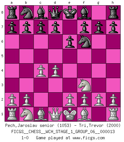 Last move : 1-0 2014 April 30 20:50:10 [Event "FICGS__CHESS__WCH_STAGE_1_GROUP_06__000013"] [Site "FICGS"] [Date "2014.03.03"] [Round "1"] [White "Pech,Jaroslav senior"] [Black "Tri,Trevor"] [Result "1-0"] [WhiteElo "1053"] [BlackElo "2000"] 1.d4 Nf6 2.c4 e6 3.Nf3 1-0 This chess game has been lost on time (started : 2014.03.03 0:12:59) Queen's pawn game Player White won this chess game. Follow this game move after move (download)Chess is above all, a fight ! (Emanuel Lasker) Wenn Spassky eine Figur opfert kannst du genauso gut aufgeben. Aber wenn Tal eine Figur opfert, spiel weiter. Er könnte noch eine weitere opfern, und dann ... wer weiß? (Miguel Najdorf) Yo tuve un dolor de muelas en la primer partida. En el segundo juego, tuve un dolor de cabeza. En el tercero, tuve un ataque de reumatísmo. En la cuarta partida, no me sentía muy bien. ¿Y en el quinto juego? Bueno, ¿que acaso uno tiene que ganar todos los juegos?. (Siegbert Tarrasch) Les Cavaliers se révèlent fort utiles dans les positions fermées. D'habitude, les Fous sont un peu plus forts que les Cavaliers dans les positions ouvertes. Qu'on le veuille ou non, il restera toujours des exceptions ! Crush them ! Make them suffer ! (General Grievous in Star Wars ep.3)