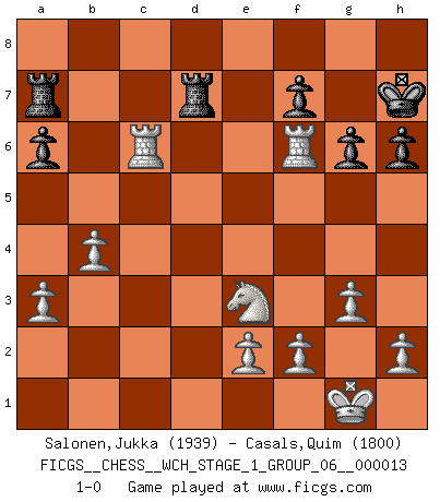 Last move : 1-0 2014 March 14 12:24:3 [Event "FICGS__CHESS__WCH_STAGE_1_GROUP_06__000013"] [Site "FICGS"] [Date "2014.03.03"] [Round "1"] [White "Salonen,Jukka"] [Black "Casals,Quim"] [Result "1-0"] [WhiteElo "1939"] [BlackElo "1800"] 1.d4 Nf6 2.c4 b6 3.Nf3 e6 4.g3 c5 5.Nc3 d5 6.Bg2 Bb7 7.O-O h6 8.Be3 a6 9.cxd5 Nxd5 10.Nxd5 exd5 11.dxc5 Bxc5 12.Bxc5 bxc5 13.Ne5 O-O 14.Rc1 Qd6 15.Nc4 Qd8 16.Ne3 Nd7 17.Bxd5 Bxd5 18.Qxd5 Qe7 19.b4 Nf6 20.Qxc5 Rfe8 21.Qxe7 Rxe7 22.a3 R8a7 23.Rc6 Kh7 24.Rfc1 g6 25.Rxf6 Red7 26.R1c6 1-0 Queen's Indian Accelerated Kingside Castling by player White (move 7) Kingside Castling by player Black (move 13) Player White won this chess game. Follow this game move after move (download)The Pawns are the soul of the game. (Francois Andre Danican Philidor) Am wohlsten fühle ich mich, wenn ich sehe, wie sich mein Gegner im Todeskampf windet. (Robert James Fischer) Los problemas de Ajedrez exigen del compositor las mismas virtudes que caracterizan todo el arte de valor: originalidad, invención, concisión, armonía, complejidad e insinceridad explendida. (Vladimir Nabokov) Il (Jacob Murray) ne joue pas pour le bon coup, mais pour le meilleur. (Eloi Relange) Locking firmely the window serves nothing, only small thiefs pass through there, the big thiefs enter through the front door. (Luc-Olivier Leclerc)