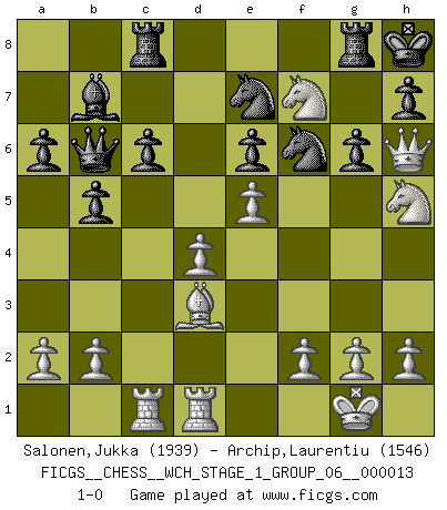 Last move : 1-0 2014 March 16 8:50:40 [Event "FICGS__CHESS__WCH_STAGE_1_GROUP_06__000013"] [Site "FICGS"] [Date "2014.03.03"] [Round "1"] [White "Salonen,Jukka"] [Black "Archip,Laurentiu"] [Result "1-0"] [WhiteElo "1939"] [BlackElo "1546"] 1.d4 d5 2.c4 dxc4 3.e4 g6 4.Bxc4 Bg7 5.Nf3 e6 6.Nc3 Ne7 7.O-O O-O 8.Be3 c6 9.Rc1 b5 10.Bd3 Bb7 11.Qd2 Nd7 12.Ne2 Rc8 13.Ng3 a6 14.Rfd1 Nf6 15.Bh6 Qb6 16.Qg5 Kh8 17.Bxg7+ Kxg7 18.e5 Nfd5 19.Nh5+ Kh8 20.Qh6 Rg8 21.Ng5 Nf6 22.Nxf7+ 1-0 QGA : 3.e4 Kingside Castling by player White (move 7) Kingside Castling by player Black (move 7) Player White won this chess game. Follow this game move after move (download)Morphy was probably the greatest genius of them all. (Bobby Fischer) Wenn ich gewinne bin ich ein Genie. Wenn nicht, dann bin ich keines. (Robert James Fischer) Hoy en día, si tu no eres un Gran Maestro a los 14 años, es mejor que lo olvides. (Anand Viswanathan) La vérité est comme le meilleur coup aux échecs : elle existe, mais il faut la chercher. (Arturo Perez-Reverte) Now the reason the enlightened prince and the wise general conquer the enemy whenever they move and their achievements surpass those of ordinary men is foreknowledge. (Sun Tzu)