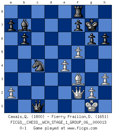Last move : 0-1 2014 April 19 20:14:37 [Event "FICGS__CHESS__WCH_STAGE_1_GROUP_06__000013"] [Site "FICGS"] [Date "2014.03.03"] [Round "1"] [White "Casals,Quim"] [Black "Fierry Fraillon,David"] [Result "0-1"] [WhiteElo "1800"] [BlackElo "1651"] 1.d4 Nf6 2.c4 g6 3.Nc3 d5 4.cxd5 Nxd5 5.e4 Nxc3 6.bxc3 Bg7 7.Bc4 O-O 8.h3 c5 9.Nf3 cxd4 10.cxd4 Nc6 11.Be3 Na5 12.Be2 b6 13.O-O Bb7 14.d5 Qd6 15.Bd4 e6 16.Bxg7 Kxg7 17.dxe6 Qxe6 18.Ng5 Qe7 19.f4 Rad8 20.Qe1 h6 21.f5 Qxg5 22.Bf3 Rd2 23.Rf2 Nc4 24.Rc1 Rxf2 25.Qxf2 Qxc1+ 0-1 King's Indian defense, 3.Nc3 Kingside Castling by player Black (move 7) Kingside Castling by player White (move 13) Player Black won this chess game. Follow this game move after move (download)First-class players lose to second-class players because second-class players sometimes play a first-class game. (Siegbert Tarrasch) Die Auseinandersetzung mit Karpow war politisch geprägt. Er stand für das kommunistische System, wurde von dessen Repräsentanten gehätschelt. Ich war der Oppositionelle. Jeder Schachweltmeister spiegelt auch die gesellschaftlichen Verhältnisse wider. Kramnik steht für die Börsen-Generation des Neuen Markts, ideologiefrei, zahlenfixiert. (Garry Kasparov) El jugador táctico debe saber que hacer cuando algo se debe de hacer. El estratégico debe saber que hacer cuando nada se debe de hacer. (Savielly Tartakover) Plusieurs personnes se sont demandées comment Tal faisait pour gagner... En fait, c'est très simple ! Il met ses pièces au centre de l'échiquier et les sacrifie quelque part ! (David Bronstein) Memory is a way of holding onto the things you love, the things you are, the things you never want to lose. (from the television show: The Wonder Years)