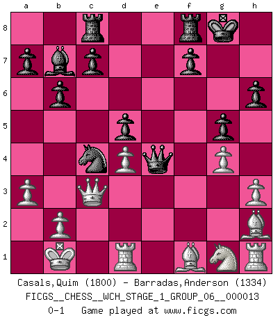 Last move : 0-1 2014 March 8 17:22:46 [Event "FICGS__CHESS__WCH_STAGE_1_GROUP_06__000013"] [Site "FICGS"] [Date "2014.03.03"] [Round "1"] [White "Casals,Quim"] [Black "Barradas,Anderson"] [Result "0-1"] [WhiteElo "1800"] [BlackElo "1334"] 1.d4 Nf6 2.c4 e6 3.Nc3 Bb4 4.Qc2 O-O 5.a3 Bxc3+ 6.Qxc3 b6 7.Bg5 h6 8.Bh4 g5 9.Bg3 Ne4 10.Qe3 Bb7 11.h3 d5 12.cxd5 exd5 13.Bh2 Nc6 14.f3 Nf6 15.Qc3 Qe7 16.O-O-O Rac8 17.Kb1 Na5 18.g4 Nc4 19.e4 Nxe4 20.fxe4 Qxe4+ 0-1 Nimzo-Indian : Classical variation Kingside Castling by player Black (move 4) Queenside Castling by player White (move 16) Player Black won this chess game. Follow this game move after move (download)Chess is like war on a board. (Bobby Fischer) Es gibt nur zwei wahre Schachgenies - das andere war Wilhelm Steinitz, der Weltmeister von 1872 bis 1894. (Robert James Fischer) El juego del Ajedrez no es solamente una diversión quieta; algunas cualidades muy valuables de la mente se pueden adquirir y cultivar con el, como convertirlos en habitos disponibles para toda ocasión; ya que la vida es algo así como el Ajedrez. (Benjamin Franklin) C'est une question de caractère, Beaucoup de gens perdent leur motivation très vite. D'autres, ils sont rares, peuvent la conserver très longtemps. J'aime les échecs, encore aujourd'hui je suis heureux d'analyser des parties. J'aime toujours gagner, je déteste encore perdre. Bien jouer est important pour mon intégrité intellectuelle et morale. Et puis les échecs vivent en ce moment une période historique grâce à Internet. Ils se développent dans les systèmes éducatifs à travers le monde. Ils sortent de leur ghetto, et c'est mon rôle de mener à bien cette révolution. (Gary Kasparov) Life is pleasant. Death is peaceful. It's the transition that's troublesome. (Isaac Asimov)