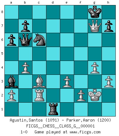 Last move : 1-0 2006 September 21 14:16:16 [Event "FICGS__CHESS__CLASS_G__000001"] [Site "FICGS"] [Date "2006.05.25"] [Round "1"] [White "Agustin,Santos"] [Black "Parker,Aaron"] [Result "1-0"] [WhiteElo "1091"] [BlackElo "1200"] 1.c4 e5 2.Nc3 c6 3.Nf3 Bd6 4.d4 Bb4 5.Nxe5 d6 6.Nd3 Ba5 7.Bd2 Bb6 8.e3 Nf6 9.Be2 Be6 10.O-O Bxc4 11.b3 Be6 12.Nf4 Bf5 13.g4 Bd7 14.h3 c5 15.Nfd5 Ba5 16.Nxf6+ Qxf6 17.Nd5 Qd8 18.Rc1 Be6 19.Nf4 Bd7 20.dxc5 Bc7 21.cxd6 Bxd6 22.Bc3 Ba3 23.Rc2 O-O 24.b4 a6 25.Qd4 f6 26.Bc4+ Kh8 27.Rd1 Nc6 28.Qxd7 Qb6 29.Nh5 Rg8 30.Bxg8 Rxg8 31.Nxf6 Rd8 32.Qf5 Rxd1+ 33.Kg2 gxf6 34.Qxf6+ Kg8 35.Qg7+ 1-0 English Opening Kingside Castling by player White (move 10) Kingside Castling by player Black (move 23) Player White won this chess game. Follow this game move after move (download)First-class players lose to second class players because second-class players sometimes play a first-class game. (Tarrasch) Ich hatte meine größten Erfolge, als ich 47 Jahre alt war. Kasparow war noch nicht mal 42 und hat das Schach schon im Stich gelassen. (Viktor Kortschnoi) Cuando no sepas que mover, espera por una idea que se le venga a la la cabeza de tu oponente. Tenlo por seguro de que esa idea estará incorrecta. (Siegbert Tarrasch) Nous vivons dans un monde échiquéen : chaque jour qui passe est un défi à relever. (Philosophe Sasha) I'm extremely disappointed. I send you out for exciting, new designer drugs, you come back with tomato sauce. (Gregory House, House M.D.)