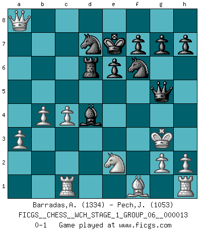 Last move : 0-1 2014 May 14 14:15:9 [Event "FICGS__CHESS__WCH_STAGE_1_GROUP_06__000013"] [Site "FICGS"] [Date "2014.03.03"] [Round "1"] [White "Barradas,Anderson"] [Black "Pech,Jaroslav senior"] [Result "0-1"] [WhiteElo "1334"] [BlackElo "1053"] 1.e4 Nf6 2.e5 Nd5 3.d4 d6 4.Nf3 Bg4 5.c4 Nb6 6.b3 dxe5 7.Be3 Bxf3 8.Qxf3 exd4 9.Qxb7 dxe3 10.fxe3 e6 11.a3 N8d7 12.Qe4 Bd6 13.Nc3 Qf6 14.Qc2 Be5 15.Rc1 Qg5 16.Qe4 Rd8 17.b4 Nf6 18.Qc6+ Ke7 19.Qc5+ Rd6 20.Qxc7+ Nbd7 21.Qxa7 Ra8 22.Qxa8 Qxe3+ 23.Ne2 Qd2+ 24.Kf2 Bd4+ 25.Kg3 Qg5+ 0-1 Alekhine's defense : Modern, Alekhine variation Player Black won this chess game. Follow this game move after move (download)Many have become Chess Masters, no one has become the Master of Chess. (Siegbert Tarrasch) Ein Remis kann durch Wiederholung von drei Zügen oder durch einen schlechte Zug erreicht werden. (Savielly Grigorievitsch Tartakower) Bendita sea la memoria de aquel que dio al mundo este juego inmortal. (A. G. Gardiner) D'abord les bases : Jouez et étudiez, puis étudiez et jouez, ensuite jouez et étudiez, puis étudiez et jouez. Deuxièmement : Donnez toujours le meilleur de vous-même ! (Ken Smith) The problem with troubleshooting is that trouble shoots back. (Anonymous)