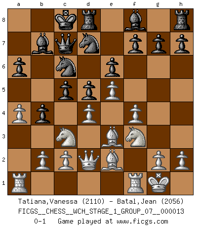 Last move : 0-1 2014 April 18 20:3:43 [Event "FICGS__CHESS__WCH_STAGE_1_GROUP_07__000013"] [Site "FICGS"] [Date "2014.03.03"] [Round "1"] [White "Tatiana,Vanessa"] [Black "Batal,Jean"] [Result "0-1"] [WhiteElo "2110"] [BlackElo "2056"] 1.e4 e6 2.d4 d5 3.Nc3 Nf6 4.e5 Nfd7 5.f4 c5 6.Nf3 Nc6 7.Be3 a6 8.Be2 b5 9.a3 Bb7 10.O-O Qc7 11.Qd2 O-O-O 12.a4 b4 0-1 This chess game has been lost on time (started : 2014.03.03 0:15:50) French : Steinitz, Boleslavsky variation Kingside Castling by player White (move 10) Queenside Castling by player Black (move 11) Player Black won this chess game. Follow this game move after move (download)In the perfect Chess combination as in a first-rate short story, the whole plot and counter-plot should lead up to a striking finale, the interest not being allayed until the very last moment. (Yates and Winter) Garry Kasparov war erst in der Großmeister-Organisation GMA, dann in der Profischach-Vereinigung PCA, zum Schluss kehrte er wieder in den Schoß der FIDE zurück. Aber gut, manche Leute sind flexibel (Viswanathan Anand) El Rey es una pieza de pelea. ¡Usenlo!. (Wilhelm Steinitz) Un journaliste : 'Vous préférez avoir une dame de plus sur l'échiquier ou au lit ?' Boris Spassky : 'Ca dépend de la position.' Inventor: A person who makes an ingenious arrangement of wheels, levers and springs, and believes it civilization. (Ambrose Bierce, The Devil's Dictionary)