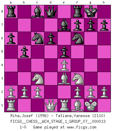 Last move : 1-0 2014 April 15 7:55:40 [Event "FICGS__CHESS__WCH_STAGE_1_GROUP_07__000013"] [Site "FICGS"] [Date "2014.03.03"] [Round "1"] [White "Riha,Josef"] [Black "Tatiana,Vanessa"] [Result "1-0"] [WhiteElo "1996"] [BlackElo "2110"] 1.e4 c5 2.Nf3 d6 3.d4 cxd4 4.Nxd4 Nf6 5.Nc3 a6 6.Bc4 e5 7.Nf3 Be7 8.O-O O-O 9.Be3 Nc6 10.Re1 b5 11.Bf1 1-0 This chess game has been lost on time (started : 2014.03.03 0:15:50) Sicilian : Najdorf, Lipnitzky attack Kingside Castling by player White (move 8) Kingside Castling by player Black (move 8) Player White won this chess game. Follow this game move after move (download)Chess demands total concentration. (Bobby Fischer) Schach ist ein Reich, wo sich die menschliche Phantasie frei entfalten kann. (David Bronstein) Fischer no está bajo la obligación de nadie. (Joseph Platz) La tactique, c'est ce que vous faites quand il y a quelque chose à faire; la stratégie, c'est ce que vous faites quand il n'y a rien à faire. (Savielli Tartacower) Horse racing is animated roulette. (Roger Kahn)