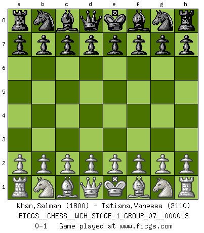 Last move : 0-1 2014 April 2 7:7:28 [Event "FICGS__CHESS__WCH_STAGE_1_GROUP_07__000013"] [Site "FICGS"] [Date "2014.03.03"] [Round "1"] [White "Khan,Salman"] [Black "Tatiana,Vanessa"] [Result "0-1"] [WhiteElo "1800"] [BlackElo "2110"] 0-1 This chess game has been lost on time (started : 2014.03.03 0:15:50) Player Black won this chess game. Follow this game move after move (download)Pawns: they are the soul of this game, they alone form the attack and defense. (Philidor) Ein Kibitz ist einer, der deinem Gegner gute Ratschläge gibt. (Andrew Soltis) Aquellos que dicen que entienden al Ajedrez, no entienden nada. (Robert Hubner) Les Echecs représentent une sphère d'idées créatrices basée sur la volonté des deux protagonistes. (Smyslov) The arrogant army will lose certainly the battle. (Chinese proverb)