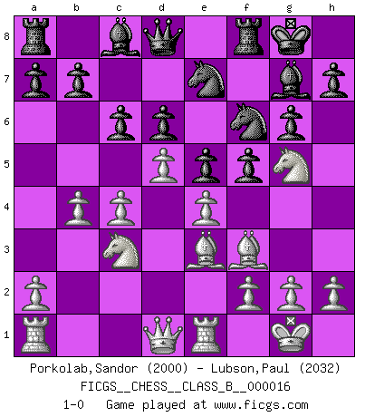 Last move : 1-0 2007 April 20 23:54:24 [Event "FICGS__CHESS__CLASS_B__000016"] [Site "FICGS"] [Date "2007.02.13"] [Round "1"] [White "Porkolab,Sandor"] [Black "Lubson,Paul"] [Result "1-0"] [WhiteElo "2000"] [BlackElo "2032"] 1.d4 Nf6 2.c4 g6 3.Nc3 Bg7 4.e4 d6 5.Nf3 O-O 6.Be2 e5 7.O-O Nc6 8.d5 Ne7 9.b4 Nh5 10.Re1 f5 11.Ng5 Nf6 12.Bf3 c6 13.Be3 1-0 King's Indian : Orthodox, Aronin-Taimanov variation (Yugoslav attack / Mar del Plata variation) Kingside Castling by player Black (move 5) Kingside Castling by player White (move 7) Player White won this chess game. Follow this game move after move (download)By playing at Chess then, we may learn: First: Foresight... Second: Circumspection... Third: Caution... And lastly, we learn by Chess the habit of not being discouraged by present bad appearances in the state of our affairs, the habit of hoping for a favorable chance, and that of persevering in the secrets of resources. (Benjamin Franklin) Es ist besser die Steine des Gegners zu opfern. (Savielly Grigorievitsch Tartakower) Aún el Rey más flojo huye despavorido ante la amenaza de un Jaque doble. (Aaron Nimzowitsch) Si je n'étais pas joueur d'échecs, je serais le meilleur dans quelque chose d'autre. (Anatoli Karpov) Nowadays, anyone who cannot speak English and is incapable of using the Internet is regarded as backward. (Al-Waleed bin Talal)