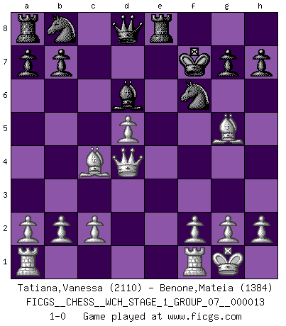 Last move : 1-0 2014 May 13 9:19:28 [Event "FICGS__CHESS__WCH_STAGE_1_GROUP_07__000013"] [Site "FICGS"] [Date "2014.03.03"] [Round "1"] [White "Tatiana,Vanessa"] [Black "Benone,Mateia"] [Result "1-0"] [WhiteElo "2110"] [BlackElo "1384"] 1.e4 e5 2.Nf3 Nf6 3.Nxe5 d6 4.Nxf7 Kxf7 5.d4 c5 6.Nc3 cxd4 7.Bc4+ d5 8.Nxd5 Be6 9.O-O Bxd5 10.exd5 Bd6 11.Qxd4 Re8 12.Bg5 1-0 This chess game has been lost on time (started : 2014.03.03 0:15:50) Petrov : Cochrane gambit Kingside Castling by player White (move 9) Player White won this chess game. Follow this game move after move (download)Could we look into the head of a Chess player, we should see there a whole world of feelings, images, ideas, emotion and passion. (Alfred Binet) Matt entspricht nicht immer den Tatsachen. (Savielly Grigorievitsch Tartakower) Las piezas de Ajedrez son los bloques del alfabeto que moldean los pensamientos; y esos pensamientos, aunque hagan un diseño visual en el tablero, expresan abstractamente su belleza como un poema. (Marcel Duchamp) Un millionnaire : 'Monsieur Steinitz ! Vous ne participez aux tournois que pour l'argent, alors que moi je n'y viens que pour l'honneur.' Steinitz : 'Chacun joue pour ce qu'il n'a pas'... You must have a dream in order to have it come true. (A.P.J. Kalam)