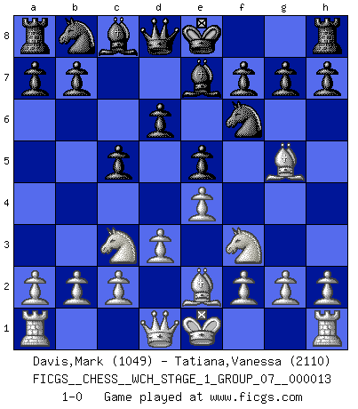 Last move : 1-0 2014 April 17 19:56:20 [Event "FICGS__CHESS__WCH_STAGE_1_GROUP_07__000013"] [Site "FICGS"] [Date "2014.03.03"] [Round "1"] [White "Davis,Mark"] [Black "Tatiana,Vanessa"] [Result "1-0"] [WhiteElo "1049"] [BlackElo "2110"] 1.e4 c5 2.Nf3 d6 3.Nc3 Nf6 4.d3 e5 5.Bg5 Be7 6.Be2 1-0 This chess game has been lost on time (started : 2014.03.03 0:15:50) Sicilian Player White won this chess game. Follow this game move after move (download)Chess is a matter of delicate judgment, knowing when to punch and how to duck. (Bobby Fischer) Nie in meinem Leben habe ich die französische Verteidigung gespielt, welche die Stumpfsinnigste von allen ist. (Wilhelm Steinitz) Solo los afeminados hacen el Enroque. (Rob Sillars) La vérité est comme le meilleur coup aux échecs : elle existe, mais il faut la chercher. (Arturo Perez-Reverte) Nothing is more important for teaching us to understand the concepts we have than constructing fictitious ones. (Ludwig Wittgenstein)