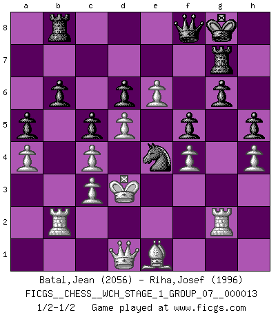 Last move : 1/2-1/2 2014 June 6 11:23:30 [Event "FICGS__CHESS__WCH_STAGE_1_GROUP_07__000013"] [Site "FICGS"] [Date "2014.03.03"] [Round "1"] [White "Batal,Jean"] [Black "Riha,Josef"] [Result "1/2-1/2"] [WhiteElo "2056"] [BlackElo "1996"] 1.c4 e5 2.g3 Nf6 3.Bg2 Nc6 4.Nc3 Bb4 5.e4 Bxc3 6.bxc3 O-O 7.d3 d6 8.Ne2 a6 9.a4 Na5 10.O-O b6 11.f4 Nd7 12.Ba3 Re8 13.Qc2 Nc5 14.Bb4 Ncb7 15.Rf2 Rb8 16.Bf3 Bd7 17.Bh5 Nc6 18.fxe5 Nxe5 19.Nf4 Bg4 20.Raf1 Qd7 21.Bxg4 Nxg4 22.Re2 Nd8 23.Ba3 Ne6 24.Bc1 Nxf4 25.gxf4 f5 26.h3 Nf6 27.e5 Nh5 28.Kh2 g6 29.d4 Qe7 30.Rg2 Kh8 31.Qa2 Qd8 32.Be3 a5 33.d5 c5 34.e6 Nf6 35.Qe2 Ne4 36.Bd2 Qf6 37.Qf3 Qe7 38.Rb1 Rf8 39.Be1 Rg8 40.Rgb2 Qe8 41.Ra2 Qf8 42.Rg2 Qf6 43.h4 Rg7 44.R1b2 h6 45.Kg1 Kh7 46.Kf1 Kg8 47.Ke2 Qf8 48.Kd3 h5 49.Qd1 1/2-1/2 English Opening Kingside Castling by player Black (move 6) Kingside Castling by player White (move 10) This chess game ended in a draw. Follow this game move after move (download)All my games are real. (Bobby Fischer) Ich spiele ehrlich und spiele, um zu gewinnen. Wenn ich verliere nehme ich meine Medizin. (Robert James Fischer) Con o sin el título, Bobby Fischer fue sin lugar a dudas el mas grande jugador de su época. (Burt Hochberg) Nous sommes les pions de la mystérieuse partie d'Echecs jouée par Dieu. Il nous déplace, nous arrête, nous pousse encore, puis nous lance un à un dans la boîte du Néant. Epitaphe sur la tombe de David Janowsky (1868-1927). Hardware: the parts of a computer that can be kicked. (Jeff Persis)