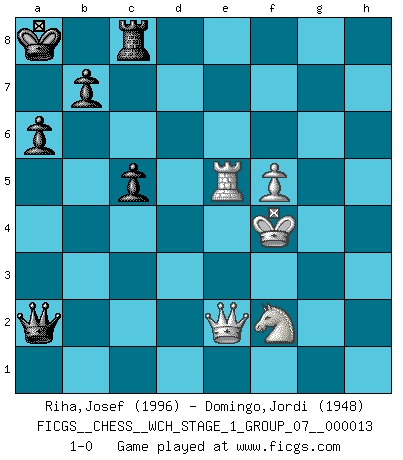 Last move : 1-0 2014 July 28 21:43:56 [Event "FICGS__CHESS__WCH_STAGE_1_GROUP_07__000013"] [Site "FICGS"] [Date "2014.03.03"] [Round "1"] [White "Riha,Josef"] [Black "Domingo,Jordi"] [Result "1-0"] [WhiteElo "1996"] [BlackElo "1948"] 1.d4 d5 2.c4 dxc4 3.e4 Nf6 4.e5 Nd5 5.Bxc4 Nb6 6.Bd3 Nc6 7.Ne2 Bg4 8.f3 Be6 9.Nbc3 Qd7 10.Ne4 Bd5 11.Nc5 Qc8 12.a3 e6 13.Qc2 Bxc5 14.Qxc5 Qd7 15.Bd2 a6 16.Qc2 Ne7 17.O-O Bc6 18.Rfe1 Bb5 19.Be4 O-O-O 20.Rac1 Kb8 21.Nc3 Bc6 22.Be3 f5 23.exf6 gxf6 24.Bxc6 Nxc6 25.Ne4 Nxd4 26.Nxf6 Qf7 27.Bxd4 Rxd4 28.Ne4 Rg8 29.Qb3 Rd5 30.Rc2 h5 31.Nc5 Qg6 32.Qc3 e5 33.Rce2 h4 34.h3 Rd4 35.Kh1 Ka7 36.Nb3 Rd5 37.Nd2 c6 38.Qe3 Qd3 39.Nf1 Qd4 40.Qc1 Rc5 41.Qb1 Qf4 42.Re4 Qg5 43.Ne3 Rd8 44.b4 Rc3 45.Qb2 R8d3 46.Qf2 Rd4 47.Rg4 Rxg4 48.hxg4 Qf4 49.a4 Qxb4 50.g5 Rd3 51.g6 Rd2 52.Qg1 h3 53.g7 Rd8 54.Rb1 hxg2+ 55.Kxg2 Qxa4 56.Kh3 Qa2 57.Rxb6 Qe6+ 58.Ng4 Ka8 59.Rb4 Qd7 60.Re4 Qxg7 61.Rxe5 Qh7+ 62.Kg3 Rh8 63.Qe3 Qh4+ 64.Kg2 Qh1+ 65.Kf2 Qh4+ 66.Ke2 Qh7 67.f4 Qc2+ 68.Qd2 Qg6 69.Nf2 Rf8 70.Qb4 Qc2+ 71.Kf3 Rc8 72.f5 c5 73.Qe4 Qb3+ 74.Kf4 Qa2 75.Qe2 1-0 QGA : 3.e4 Kingside Castling by player White (move 17) Queenside Castling by player Black (move 19) Player White won this chess game. Follow this game move after move (download)Bobby is the most misunderstood, misquoted celebrity walking the face of this earth. (Yasser Seirawan) Wenn es im Universum noch irgendwo intelligente Lebewesen gibt, dann kennen sie Go. (Emanuel Lasker) Bobby Fischer es el mas grande genio de Ajedrez de todos los tiempos. (Alexander Kotov) On est toujours la mazette de quelqu'un d'autre. (Anonyme) Luck is when opportunity knocks and you answer. (Anonymous)
