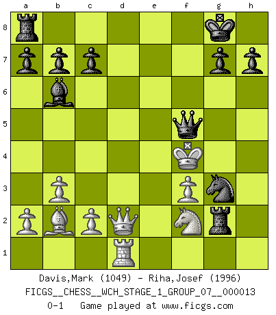 Last move : 0-1 2014 April 14 8:28:35 [Event "FICGS__CHESS__WCH_STAGE_1_GROUP_07__000013"] [Site "FICGS"] [Date "2014.03.03"] [Round "1"] [White "Davis,Mark"] [Black "Riha,Josef"] [Result "0-1"] [WhiteElo "1049"] [BlackElo "1996"] 1.e4 e5 2.Nf3 Nc6 3.b3 Nf6 4.d3 Bc5 5.Bb2 d5 6.exd5 Nxd5 7.Be2 Nf4 8.O-O O-O 9.Nbd2 Re8 10.Ne4 Bb6 11.Qd2 f6 12.Rad1 Bg4 13.h3 Bxh3 14.gxh3 Qd7 15.Nxe5 fxe5 16.Bg4 Nxh3+ 17.Kh2 Qxg4 18.f3 Qh4 19.Kg2 Re6 20.Rh1 Rg6+ 21.Kf1 Nf4 22.d4 Qxh1+ 23.Kf2 Rg2+ 24.Ke3 Nxd4 25.Nf2 Nf5+ 26.Ke4 Ng3+ 27.Kxe5 Qh5+ 28.Kxf4 Qf5+ 0-1 King's pawn game Kingside Castling by player White (move 8) Kingside Castling by player Black (move 8) Player Black won this chess game. Follow this game move after move (download)Every Pawn is a potential Queen. (James Mason) Der Traum, für den ich lebe, ist der von einem freien Russland. Viele mögen sagen: Russland hat doch ein Parlament, einen gewählten Präsidenten. Aber ich spüre, dass in meiner Heimat die Angst wiederkehrt. Eine Angst, sich frei zu äußern, bestimmte Dinge zu tun (Garry Kasparov) Los Peones son el alma de una partida de Ajedrez. (Francois Andre Danican Philidor) C'est la seule position que je connaisse où les deux camps sont mals. Propos prêtés à V. Anand. He who laughs last probably does not get the joke. (Unknown)
