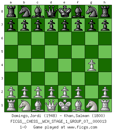 Last move : 1-0 2014 April 2 7:7:28 [Event "FICGS__CHESS__WCH_STAGE_1_GROUP_07__000013"] [Site "FICGS"] [Date "2014.03.03"] [Round "1"] [White "Domingo,Jordi"] [Black "Khan,Salman"] [Result "1-0"] [WhiteElo "1948"] [BlackElo "1800"] 1.g4 1-0 This chess game has been lost on time (started : 2014.03.03 0:15:50) Grob's attack Player White won this chess game. Follow this game move after move (download)A big shock; the best chess player in history has passed away. (Lajos Portisch, about Bobby Fischer's death) Ich bin es gewohnt, das die Jugend mir überhaupt keinen Respekt entgegenbringt. (Alexander Morozewich) EL Ajedrez es como la vida. (Boris Spassky) La tactique, c'est ce que vous faites quand il y a quelque chose à faire; la stratégie, c'est ce que vous faites quand il n'y a rien à faire. (Savielli Tartacower) Life is like a game of cards: the hand you are dealt represents determinism; the way you play it is free will. (Jawaharlal Nehru)