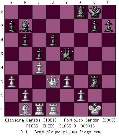 Last move : 0-1 2007 July 17 16:20:52 [Event "FICGS__CHESS__CLASS_B__000016"] [Site "FICGS"] [Date "2007.02.13"] [Round "1"] [White "Oliveira,Carlos"] [Black "Porkolab,Sandor"] [Result "0-1"] [WhiteElo "1981"] [BlackElo "2000"] 1.d4 Nf6 2.c4 e6 3.Nc3 Bb4 4.e3 b6 5.Bd3 Bb7 6.Nf3 O-O 7.O-O c5 8.Qe2 d6 9.Bd2 Nbd7 10.a3 Bxc3 11.Bxc3 Ne4 12.Rac1 f5 13.Rfd1 Qf6 14.d5 Nxc3 15.Rxc3 Rae8 16.dxe6 Rxe6 17.Bb1 Ne5 18.Nxe5 Qxe5 19.R3c1 f4 20.Qd3 Rg6 21.g3 fxg3 22.hxg3 Rxg3+ 0-1 Nimzo-Indian : Fischer variation Kingside Castling by player Black (move 6) Kingside Castling by player White (move 7) Player Black won this chess game. Follow this game move after move (download)Chess is imagination. (David Bronstein) Über Frauen: Chess is better. (Robert James Fischer) Un entendimiento a fondo de las continuaciones típicas del mate, hace de las combinaciones de sacrificio mas complicadas conducirlas a ellas no solo sin dificultad, sino casi de una manera natural. (Siegbert Tarrasch) Aidez vos pièces, elles vous aideront. (Paul Morphy) Unless I accept my faults I will most certainly doubt my virtues. (Hugh Prather)