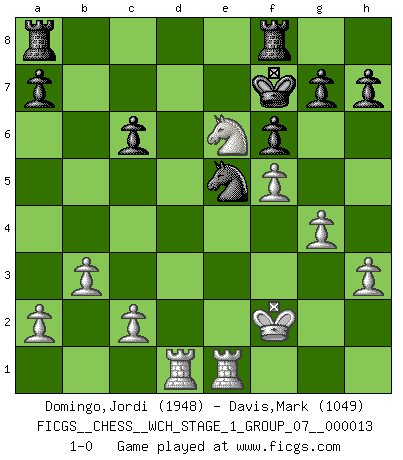 Last move : 1-0 2014 May 24 21:46:45 [Event "FICGS__CHESS__WCH_STAGE_1_GROUP_07__000013"] [Site "FICGS"] [Date "2014.03.03"] [Round "1"] [White "Domingo,Jordi"] [Black "Davis,Mark"] [Result "1-0"] [WhiteElo "1948"] [BlackElo "1049"] 1.g4 d5 2.h3 Nc6 3.d4 e5 4.dxe5 Nxe5 5.Bg2 c6 6.e4 Nf6 7.exd5 Nxd5 8.Qe2 Qe7 9.Bxd5 cxd5 10.Nc3 Qe6 11.f4 Nc4 12.Nxd5 Bd6 13.f5 Bg3+ 14.Kf1 Qxe2+ 15.Nxe2 Bd6 16.Bf4 Bxf4 17.Nexf4 O-O 18.b3 Ne5 19.Kf2 Bd7 20.Rhe1 f6 21.Rad1 Bc6 22.Ne7+ Kf7 23.Nxc6 bxc6 24.Ne6 1-0 This chess game has been lost on time (started : 2014.03.03 0:15:50) Grob's attack Kingside Castling by player Black (move 17) Player White won this chess game. Follow this game move after move (download)Winning isn't everything... but losing is nothing. (Mednis) Das ganze Leben mit einer Ehefrau ist wie ein Endspiel mit ungleichfarbigen Läufern. (Viktor Kortschnoi) Dios mío, Bobby Fischer juega tan simple. (Alexei Suetin) Il n'y a plus de joueurs du niveau de Jacob Murray dont la seule quête est le beau jeu, le plaisir de voir les pièces construire quelque chose. Sur 10 idées à la minute, 9 seront sans intérêt, la dernière s'avèrera géniale. (Christian Bauer) No enterprise is more likely to succeed than one concealed from the enemy until it is ripe for execution. (Niccolo Machiavelli)