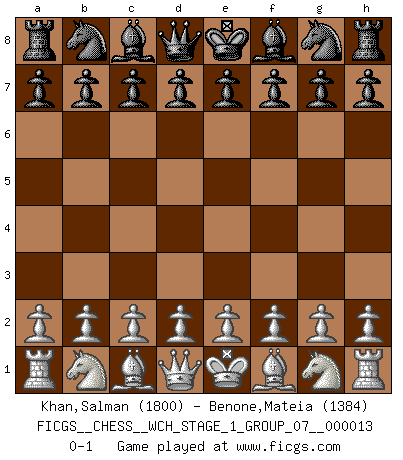 Last move : 0-1 2014 April 2 7:7:28 [Event "FICGS__CHESS__WCH_STAGE_1_GROUP_07__000013"] [Site "FICGS"] [Date "2014.03.03"] [Round "1"] [White "Khan,Salman"] [Black "Benone,Mateia"] [Result "0-1"] [WhiteElo "1800"] [BlackElo "1384"] 0-1 This chess game has been lost on time (started : 2014.03.03 0:15:50) Player Black won this chess game. Follow this game move after move (download)Chess teaches you to control the initial excitement you feel when you see something that looks good and it trains you to think objectively when you're in trouble. (Stanley Kubrick) Ohne ihre Erfolge schmälern zu wollen würde ich sagen Petrosian, Spassky und Karpov verdanken ihre Siege ihren Trainern - Boleslavsky, Bondarevsky und Furman. (Mikhail Moiseyevich Botvinik) El Ajedrez no es una pizca de inferior al violín, y tenemos un gran número de violinistas profesionales. (Mikhail Botvinnik) J'ai vu le vaincu d'Echecs jouer des années durant dans l'espoir de la fête de la victoire. Car tu es plus riche de ce qu'elle existe si même elle n'est point pour toi. Ainsi de la perle du fond des mers. (Antoine de Saint-Exupéry) There are two major products that came out of Berkeley: LSD and UNIX. We do not believe this is to be a coincidence. (Jeremy S. Anderson)