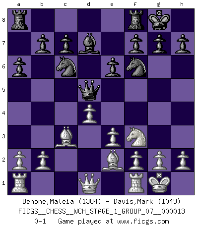 Last move : 0-1 2014 May 13 9:19:28 [Event "FICGS__CHESS__WCH_STAGE_1_GROUP_07__000013"] [Site "FICGS"] [Date "2014.03.03"] [Round "1"] [White "Benone,Mateia"] [Black "Davis,Mark"] [Result "0-1"] [WhiteElo "1384"] [BlackElo "1049"] 1.Nf3 d5 2.d4 Nc6 3.c4 e6 4.Nc3 Bb4 5.cxd5 Qxd5 6.Bd2 Bxc3 7.Bxc3 Nf6 8.e3 O-O 9.Be2 Bd7 10.O-O a6 0-1 This chess game has been lost on time (started : 2014.03.03 0:15:50) Reti Opening Kingside Castling by player Black (move 8) Kingside Castling by player White (move 10) Player Black won this chess game. Follow this game move after move (download)The Pin is mightier than the sword. (Fred Reinfeld) Später, ... hatte ich zunehmend Erfolg in entscheidenden Partien. Vielleicht weil ich eine einfache Wahrheit erkannte: nicht nur ich hatte Angst, auch mein Gegner. (Mikhail Nekhemyevich Tal) Con el fin de mejorar tu juego, debes de estudiar los finales antes que todo, ya que mientras que los finales pueden ser estudiados y dominados por sí mismos, el juegomedio y la apertura deben de ser estudiados en relación con los finales. (José Raúl Capablanca) Les réformistes prétendent que les progrès de la théorie conduiront à la disparition des échecs, et qu'il faut, pour leur rendre vie, en remanier les règles. En réalité, qu'exprime cette affirmation? Le mépris de l'intuition, de l'imagination et de tous les autres éléments qui font des échecs un art. (Alexander Alekhine) No, no, you're not thinking; you're just being logical. (Niels Bohr)