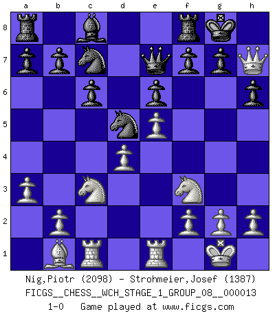 Last move : 1-0 2014 May 5 20:3:54 [Event "FICGS__CHESS__WCH_STAGE_1_GROUP_08__000013"] [Site "FICGS"] [Date "2014.03.03"] [Round "1"] [White "Nig,Piotr"] [Black "Strohmeier,Josef"] [Result "1-0"] [WhiteElo "2098"] [BlackElo "1387"] 1.d4 d5 2.Nf3 Nf6 3.c4 e6 4.Nc3 Be7 5.Bg5 O-O 6.e3 c6 7.Bd3 dxc4 8.Bxc4 Nd5 9.Bxe7 Qxe7 10.O-O Nd7 11.Rc1 N7b6 12.Bd3 Nb4 13.Bb1 h6 14.e4 Na6 15.a3 Nd7 16.e5 Nb6 17.Re1 Nd5 18.Qd3 Nac7 19.Qh7+ 1-0 Queen's pawn game Kingside Castling by player Black (move 5) Kingside Castling by player White (move 10) Player White won this chess game. Follow this game move after move (download)I feel as if I were a piece in a game of Chess, when my opponent says of it: That piece cannot be moved. (Soren Kierkegaard) Im Blitz ist es einfacher mit einer Figur weniger anzugreifen, als sich mit einer Mehrfigur zu verteidigen. (Mikhail Nekhemyevich Tal) Si pudieramos observar el interior de la cabeza de un jugador de Ajedrez, encontraríamos ahí un mundo lleno de sentimientos, imágenes, ideas, emoción y pasión. (Alfred Binet) Pour moi, les échecs ne sont pas un jeu mais un art. (Alexandre Alekhine) He who fights with monsters should be careful lest he thereby become a monster. (Friedrich Nietzsche, Beyond Good and Evil)