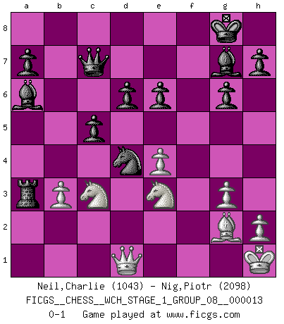 Last move : 0-1 2014 April 21 23:15:35 [Event "FICGS__CHESS__WCH_STAGE_1_GROUP_08__000013"] [Site "FICGS"] [Date "2014.03.03"] [Round "1"] [White "Neil,Charlie"] [Black "Nig,Piotr"] [Result "0-1"] [WhiteElo "1043"] [BlackElo "2098"] 1.e4 c5 2.Nc3 d6 3.g3 g6 4.Bg2 Bg7 5.Nge2 Nc6 6.d3 e6 7.Rb1 Rb8 8.O-O b5 9.Qe1 b4 10.Nd1 Nge7 11.b3 O-O 12.Bb2 Nd4 13.Ne3 Nec6 14.f4 Qc7 15.c4 bxc3 16.Nxc3 Nb4 17.f5 Nxd3 18.Qd2 Ba6 19.fxe6 fxe6 20.Rxf8+ Rxf8 21.Kh1 Rf2 22.Qd1 Nxb2 23.Rxb2 Rxb2 24.Na4 Rxa2 25.Nc3 Ra3 0-1 Sicilian : Closed Kingside Castling by player White (move 8) Kingside Castling by player Black (move 11) Player Black won this chess game. Follow this game move after move (download)You sit at the board and suddenly your heart leaps. Your hand trembles to pick up the piece and move it. But what Chess teaches you is that you must sit there calmly and think about whether it's really a good idea and whether there are other better ideas. (Stanley Kubrick) Moralische Siege zählen nicht. (Savielly Grigorievitsch Tartakower) Cuando me preguntan: -¿Cual es el secreto que te hace hacer mejores movidas que tus oponentes?, Yo respondo: Me da gusto que me pregunten eso, porque, como veran, hay una simple razón. Yo pienso mis propias movidas y dejo a mi oponente que el piense las suyas. (Alexander Alekhine) Les sacrifices démontrent seulement que quelqu'un a gaffé. (Savielly Tartacover) There's no money in correspondence chess. (John Knudsen)