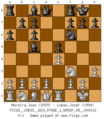 Last move : 0-1 2014 May 1 8:49:48 [Event "FICGS__CHESS__WCH_STAGE_1_GROUP_08__000013"] [Site "FICGS"] [Date "2014.03.03"] [Round "1"] [White "Moreira,Jose"] [Black "Lubas,Jozef"] [Result "0-1"] [WhiteElo "2059"] [BlackElo "1994"] 1.e4 e5 2.Nf3 Nc6 3.Bb5 a6 4.Ba4 Nf6 5.O-O Be7 6.Bxc6 dxc6 7.Re1 Bc5 8.h3 O-O 0-1 This chess game has been lost on time (started : 2014.03.03 0:17:33) Ruy Lopez : Exchange variation doubly deferred (DERLD) Kingside Castling by player White (move 5) Kingside Castling by player Black (move 8) Player Black won this chess game. Follow this game move after move (download)A Chess game is a dialogue, a conversation between a player and his opponent. Each move by the opponent may contain threats or be a blunder, but a player cannot defend against threats or take advantage of blunders if he does not first ask himself: What is my opponent planning after each move ? (Bruce A. Moon) Er war ein guter Schachspieler, aber ich kann Leute nicht ausstehen, die 'Heil Hitler' rufen (Über Alexander Aljechin). (Miguel Najdorf) No soy una persona materialista y por eso, no resiento la falta o pérdida del dinero. La ausencia de cosas mundanas carece de importancia. Ya que el Ajedrez es una forma en la que puedo ser tan materialista como yo desee sin tener la necesidad de vender mi alma. (Jamie Walter Adams) Toutes choses étant égales, c'est la conviction qui gagne. Alliée à une volonté de vaincre, elle sert de détonateur, suscite des idées, disperse les doutes et aide à penser clairement. (Robert Fischer) The Internet is so big, so powerful and pointless that for some people it is a complete substitute for life. (Andrew Brown)