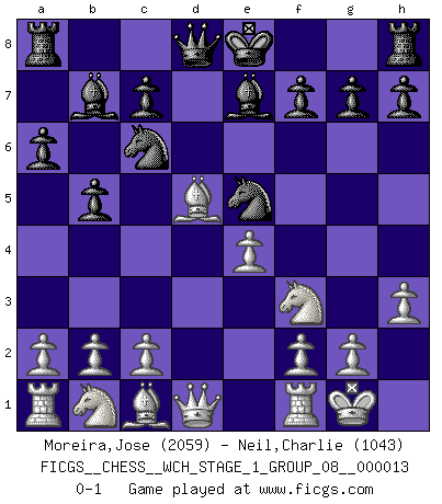 Last move : 0-1 2014 April 22 20:17:35 [Event "FICGS__CHESS__WCH_STAGE_1_GROUP_08__000013"] [Site "FICGS"] [Date "2014.03.03"] [Round "1"] [White "Moreira,Jose"] [Black "Neil,Charlie"] [Result "0-1"] [WhiteElo "2059"] [BlackElo "1043"] 1.e4 e5 2.Nf3 Nc6 3.Bb5 a6 4.Ba4 Nf6 5.O-O b5 6.Bb3 Be7 7.d4 d5 8.dxe5 Ng4 9.Bxd5 Bb7 10.h3 Ngxe5 0-1 This chess game has been lost on time (started : 2014.03.03 0:17:33) Ruy Lopez : 5.O-O Kingside Castling by player White (move 5) Player Black won this chess game. Follow this game move after move (download)You sit at the board and suddenly your heart leaps. Your hand trembles to pick up the piece and move it. But what Chess teaches you is that you must sit there calmly and think about whether it's really a good idea and whether there are other better ideas. (Stanley Kubrick) Der Traum, für den ich lebe, ist der von einem freien Russland. Viele mögen sagen: Russland hat doch ein Parlament, einen gewählten Präsidenten. Aber ich spüre, dass in meiner Heimat die Angst wiederkehrt. Eine Angst, sich frei zu äußern, bestimmte Dinge zu tun (Garry Kasparov) Con el fin de mejorar tu juego, debes de estudiar los finales antes que todo, ya que mientras que los finales pueden ser estudiados y dominados por sí mismos, el juegomedio y la apertura deben de ser estudiados en relación con los finales. (José Raúl Capablanca) Les Echecs mettent en conflit, non pas deux intelligences, mais deux volontés. (Lasker) To err is human, to shift the blame on someone else is tactical. (Mladen Jankovic)