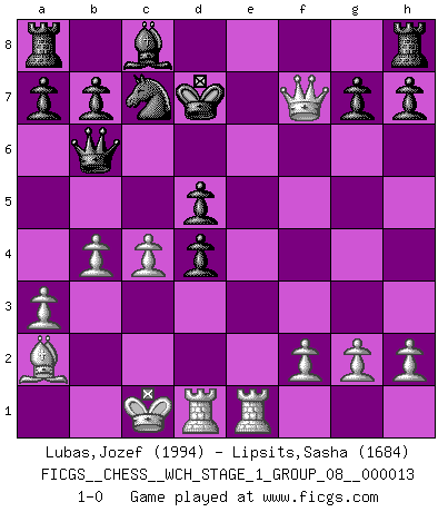 Last move : 1-0 2014 March 24 15:52:8 [Event "FICGS__CHESS__WCH_STAGE_1_GROUP_08__000013"] [Site "FICGS"] [Date "2014.03.03"] [Round "1"] [White "Lubas,Jozef"] [Black "Lipsits,Sasha"] [Result "1-0"] [WhiteElo "1994"] [BlackElo "1684"] 1.e4 e5 2.Nf3 Nc6 3.Bc4 Nf6 4.Ng5 d5 5.exd5 Nxd5 6.Nxf7 Kxf7 7.Qf3+ Ke6 8.Nc3 Ncb4 9.Bb3 c6 10.a3 Na6 11.Nxd5 cxd5 12.d4 exd4 13.Bf4 Qa5+ 14.c3 Qb5 15.Ba2 Bd6 16.O-O-O Nc7 17.Rhe1+ Kd7 18.Bxd6 Kxd6 19.c4 Qb6 20.b4 Kd7 21.Qf7+ 1-0 Two knights defense : Fegatello attack Queenside Castling by player White (move 16) Player White won this chess game. Follow this game move after move (download)Blessed be the memory of him who gave the world this immortal game. (A. G. Gardiner) Die FIDE ist dabei in die Hände der russischen Mafia zu fallen. (Larry Evans) No es tiempo de jugar al Ajedrez cuando la casa esta en llamas. (Proverbio Italiano) Nous vivons dans un monde échiquéen : chaque jour qui passe est un défi à relever. (Philosophe Sasha) Art is not a thing, it is a way. (Elbert Hubbard)