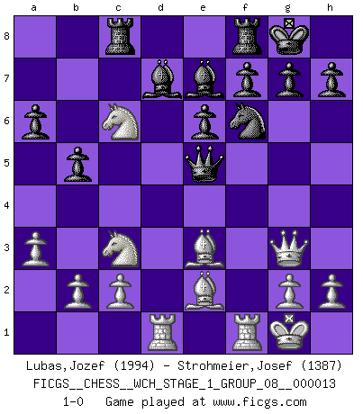 Last move : 1-0 2014 May 3 0:8:32 [Event "FICGS__CHESS__WCH_STAGE_1_GROUP_08__000013"] [Site "FICGS"] [Date "2014.03.03"] [Round "1"] [White "Lubas,Jozef"] [Black "Strohmeier,Josef"] [Result "1-0"] [WhiteElo "1994"] [BlackElo "1387"] 1.e4 c5 2.Nf3 Nc6 3.d4 cxd4 4.Nxd4 Nf6 5.Nc3 e6 6.a3 d6 7.Be2 Be7 8.O-O O-O 9.Be3 Bd7 10.f4 a6 11.Qe1 Rc8 12.Rd1 Qc7 13.Qg3 b5 14.e5 dxe5 15.fxe5 Qxe5 16.Nxc6 1-0 Sicilian defense Kingside Castling by player White (move 8) Kingside Castling by player Black (move 8) Player White won this chess game. Follow this game move after move (download)Botvinnik tried to take the mystery out of Chess, always relating it to situations in ordinary life. He used to call Chess a typical inexact problem similar to those which people are always having to solve in everyday life. (Garry Kasparov) Ich könnte leicht behaupten: Ja,ja, Leonid Breschnew wollte nicht, daß ich Weltmeister werde. In der Tat war die Sache komplizierter. (Viktor Kortschnoi) El arma más poderosa en el Ajedrez, es tener la próxima movida. (David Bronstein) Les réformistes prétendent que les progrès de la théorie conduiront à la disparition des échecs, et qu'il faut, pour leur rendre vie, en remanier les règles. En réalité, qu'exprime cette affirmation? Le mépris de l'intuition, de l'imagination et de tous les autres éléments qui font des échecs un art. (Alexander Alekhine) There is a great deal of difference between an eager man who wants to read a book and a tired man who wants a book to read. (G.K. Chesterton)
