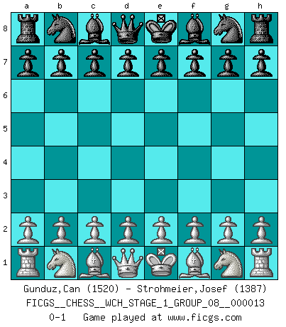 Last move : 0-1 2014 April 2 7:7:28 [Event "FICGS__CHESS__WCH_STAGE_1_GROUP_08__000013"] [Site "FICGS"] [Date "2014.03.03"] [Round "1"] [White "Gunduz,Can"] [Black "Strohmeier,Josef"] [Result "0-1"] [WhiteElo "1520"] [BlackElo "1387"] 0-1 This chess game has been lost on time (started : 2014.03.03 0:17:33) Player Black won this chess game. Follow this game move after move (download)The older I grow, the more I value Pawns. (Keres) Ich brauche nur einen Blick auf das Schachbrett zu werfen, und weiß schon, was in der Stellung steckt, was geschehen kann und was geschehen wird. Alle übrigen suchen und prüfen, ich aber weiß es! (José Raúl Capablanca) En manos de Fischer's, una diminuta ventaja teórica es tan buena como tener una Reina de ventaja. (Isaac Kashdan) A ce moment-là, je menaçais de comprendre la position ! (Clément L'Heureux) Happy endings are just stories that haven't finished yet. (Jane Smith in Mr & Mrs Smith)