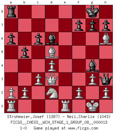 Last move : 1-0 2014 May 10 22:48:3 [Event "FICGS__CHESS__WCH_STAGE_1_GROUP_08__000013"] [Site "FICGS"] [Date "2014.03.03"] [Round "1"] [White "Strohmeier,Josef"] [Black "Neil,Charlie"] [Result "1-0"] [WhiteElo "1387"] [BlackElo "1043"] 1.e4 e5 2.Nf3 Nc6 3.Bb5 a6 4.Ba4 Nf6 5.O-O b5 6.Bb3 Be7 7.Re1 O-O 8.c3 d5 9.exd5 Nxd5 10.Nxe5 Nxe5 11.Rxe5 c6 12.d4 Bd6 13.Re1 Qh4 14.g3 Qh3 15.Be3 Bg4 16.Qd3 Rfe8 17.Nd2 Re6 18.Bxd5 Rh6 19.Bxh6 1-0 Ruy Lopez : 5.O-O Kingside Castling by player White (move 5) Kingside Castling by player Black (move 7) Player White won this chess game. Follow this game move after move (download)Chess is ruthless: you've got to be prepared to kill people. (Nigel Short) Jeder leidlich begabte Spieler, er braucht keineswegs hervorragend veranlagt zu sein, kann es zum Meister bringen. Aber das ist ja auch gar nicht nötig! Der richtige Standpunkt ist es, zu seinem Vergnügen zu spielen, und man glaube ja nicht, dass der Genuss proportional dem Können sei. (Siegbert Tarrasch) Si yo gano un torneo, yo lo gano por mí mismo. Yo hago las jugadas. Nadie me ayuda. (Bobby Fischer) Echiquier : carré parfait, comme la Jérusalem nouvelle décrite par l'auteur de l'Apocalypse, huit cases sur huit, exaltation du chiffre 4, symbole du cosmos aux quatre horizons... où le noir et le blanc, l'ombre et la lumière, le mal et le bien s'entremêlent et se conjuguent. (Robert Couffignal, Le Gambit du poète) History is the quarrels of popes and kings, with wars or pestilences in every page; the men all so good for nothing, and hardly any women at all. (Jane Austen)
