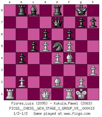 Last move : 1/2-1/2 2014 May 30 0:15:40 [Event "FICGS__CHESS__WCH_STAGE_1_GROUP_09__000013"] [Site "FICGS"] [Date "2014.03.03"] [Round "1"] [White "Flores,Luis"] [Black "Kukula,Pawel"] [Result "1/2-1/2"] [WhiteElo "2095"] [BlackElo "2063"] 1.e4 e5 2.Nf3 Nc6 3.Bb5 a6 4.Ba4 Nf6 5.O-O Be7 6.Re1 b5 7.Bb3 d6 8.c3 O-O 9.h3 Na5 10.Bc2 c5 11.d4 Nd7 12.Nbd2 exd4 13.cxd4 Nc6 14.d5 Nce5 15.a4 Rb8 16.axb5 axb5 17.Nxe5 Nxe5 18.f4 Ng6 19.Nf3 Bh4 20.Nxh4 Qxh4 21.f5 Ne5 22.Rf1 b4 23.Bf4 Qe7 24.Bd3 Re8 25.Be2 f6 1/2-1/2 Ruy Lopez : Closed Kingside Castling by player White (move 5) Kingside Castling by player Black (move 8) This chess game ended in a draw. Follow this game move after move (download)In complicated positions, Bobby Fischer hardly had to be afraid of anybody. (Paul Keres) Schach ist das Spiel, das die Verrückten gesund hält. (Albert Einstein) De eso se trata el Ajedrez. Un día le das una lección a tu oponente y al día siguiente el te da una a tí. (Bobby Fischer) Demandez au pauvre Cg1 ce qu'il en pense. Eduard Gufeld à propos de la variante Saemisch de l'Est-Indienne. A shortcut is the longest distance between two points. (Don Groves)