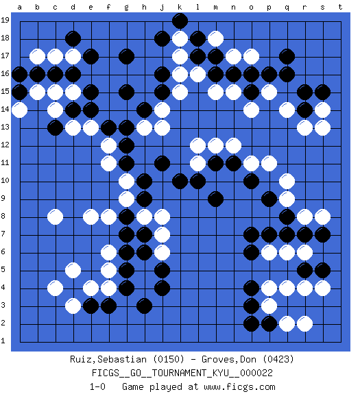 Last move : 1-0 2007 April 14 0:51:59 [Event "FICGS__GO__TOURNAMENT_KYU__000022 "] [Site "FICGS"] [Date "2007.02.14"] [Round "1"] [Black "Ruiz,Sebastian "] [White "Groves,Don "] [Result "1-0"] [Rating 1 "0150"] [Rating 2 "0423"] 1.q16 c4 2.d16 q4 3.e3 d5 4.h3 c8 5.o3 q10 6.q7 r13 7.r14 c14 8.d14 d13 9.e14 c15 10.c16 e13 11.f13 k17 12.g17 o17 13.q17 r6 14.r7 q6 15.o7 r8 16.s7 s8 17.s5 p6 18.p7 s4 19.r5 p4 20.o4 r4 21.o6 p3 22.p2 q2 23.o2 r2 24.q8 q14 25.r15 p15 26.m17 l16 27.m16 m15 28.o16 n17 29.n16 m18 30.l17 k15 31.l18 n15 32.o15 o14 33.p16 f4 34.f3 h4 35.j4 h5 36.j5 j6 37.h6 j7 38.g6 e4 39.g4 f5 40.g5 f6 41.g8 f12 42.g13 e8 43.g12 f11 44.g11 g10 45.h10 g9 46.h9 h8 47.h7 j8 48.k10 s14 49.s15 s13 50.j16 k16 51.j15 j14 52.h14 j13 53.j11 h13 54.g15 q9 55.m9 l12 56.m11 n12 57.n11 o11 58.o10 p11 59.p9 d3 60.j18 f8 61.g7 d15 62.e15 c17 63.b16 d17 64.e17 b17 65.d18 b15 66.a16 k18 67.k19 l11 68.l10 m12 69.a15 a14 70.c13 1-0 Here are the names of the openings (joseki) played in the four corners : Corner d4 : c4 e3Komoku (Somok, Xiao~mu`) 3-4 Point. The komoku (3-4) point is the traditional corner enclosure move..Ikken Kakari (Hankan Keolch'im, Yi Gua`jiao~, 1-Space Low Pincer). The small knight move is the basic approach move to the 3-4 point stone. It has been continually used for over four centuries. There are limitless variations, with new moves constantly being discovered. Black 2 opens the door to a treaure store of joseki. Corner q4 : q4 o3Hoshi (Hwajeom, Seongjeom, Xingwei`) 4-4 Point. The star or hoshi (4-4) point, emphasizing influence at the potential expense of territory.Ikken Kakari (Hankan Keolch'im, Yi Gua`jiao~, 1-Space Low Approach). Black 2 is the standard approach move to the 4-4. Corner q16 : q16 r13Hoshi (Hwajeom, Seongjeom, Xingwei`) 4-4 Point. The star or hoshi (4-4) point, emphasizing influence at the potential expense of territory.Nikken Kakari (Dukan Keolch'im, E`r Gua`jiao~, 2-Space Low Approach). Black typically answers by 7-3 or 3-5 (which is not joseki). Corner d16 : d16 c14Hoshi (Hwajeom, Seongjeom, Xingwei`) 4-4 Point. The star or hoshi (4-4) point, emphasizing influence at the potential expense of territory.Ikken Kakari (Hankan Keolch'im, Yi Gua`jiao~, 1-Space Low Approach). White 2 is the standard approach move to the 4-4. Player Black won this Go (weiqi, baduk) game.Follow this game move after move (download ) You have to like to win, and to learn to recognize the errors that gave you the victory. (Pierre Audouard) God is an atheist. (Unknown)