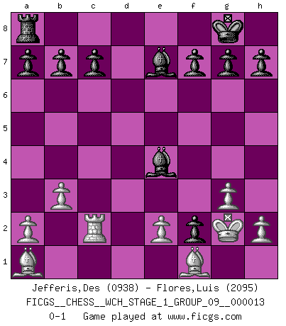 Last move : 0-1 2014 May 4 12:54:36 [Event "FICGS__CHESS__WCH_STAGE_1_GROUP_09__000013"] [Site "FICGS"] [Date "2014.03.03"] [Round "1"] [White "Jefferis,Des"] [Black "Flores,Luis"] [Result "0-1"] [WhiteElo "0938"] [BlackElo "2095"] 1.g3 d5 2.Bg2 e5 3.d3 Nf6 4.Nf3 Nc6 5.O-O Be7 6.b3 O-O 7.Bb2 e4 8.dxe4 dxe4 9.Qxd8 Rxd8 10.Nfd2 Nb4 11.Rc1 e3 12.Ne4 Nxc2 13.Rxc2 Rd1+ 14.Bf1 Nxe4 15.Nc3 exf2+ 16.Kg2 Rxa1 17.Bxa1 Bf5 18.Nxe4 Bxe4+ 0-1 Benko's Opening Kingside Castling by player White (move 5) Kingside Castling by player Black (move 6) Player Black won this chess game. Follow this game move after move (download)I love all positions. Give me a difficult positional game, I will play it. But totally won positions, I cannot stand them. (Hein Donner) Ich kenne keine einzige Person, die behaupten würde, Garri Kasparow sei ein guter Mensch (Nigel Short) Los errores estan ahí, esperando a que se cometan. (Savielly Tartakower) Le temps de noter son nom sur la feuille de partie, j'étais déjà en zeitnot ! D'un modeste amateur apparié lors de la première ronde d'un open contre le grand-maître Azmaïparashvili. Creativity involves breaking out of established patterns in order to look at things in a different way. (Edward De Bono)