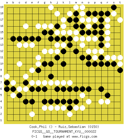 Last move : 0-1 2007 May 26 23:42:2 [Event "FICGS__GO__TOURNAMENT_KYU__000022"] [Site "FICGS"] [Date "2007.02.14"] [Round "1"] [Black "Cook,Phil"] [White "Ruiz,Sebastian"] [Result "0-1"] [Rating 2 "0150"] 1.q16 d16 2.d4 q4 3.q6 o4 4.m4 n5 5.r5 r11 6.q10 r14 7.q13 r13 8.q14 r15 9.q15 k16 10.m16 c6 11.c5 d6 12.e4 c10 13.l17 k17 14.k18 j18 15.j19 h19 16.k19 l18 17.j16 g3 18.g4 e2 19.j4 h3 20.h4 j3 21.k4 l2 22.l3 k3 23.e6 e7 24.g6 f7 25.f6 g7 26.j6 j7 27.l6 k7 28.k6 l7 29.m6 m3 30.l4 k15 31.j14 j15 32.k14 l15 33.k12 j12 34.k10 n3 35.n6 r4 36.o6 m14 37.m12 n13 38.n11 o12 39.o10 p11 40.q11 q12 41.o11 r16 42.q17 r17 43.q18 n18 44.m18 m19 45.l19 l18 46.m17 n17 47.n16 o16 48.o15 p17 49.p16 o17 50.r18 s18 51.s19 t17 52.p10 p12 53.r10 s11 54.s10 t10 55.t9 t11 56.j11 h12 57.h14 g12 58.f14 k13 59.l13 j13 60.l14 m15 61.p18 o14 62.o18 n19 63.h8 h7 64.h10 f10 65.g10 f11 66.n15 p14 67.p15 n14 68.h15 h16 69.d14 e13 70.e14 d13 71.c14 c13 72.b14 g16 73.g15 f16 74.f9 e9 75.b6 b7 76.d7 d8 77.a7 b5 78.a6 a8 0-1 Here are the names of the openings (joseki) played in the four corners : Corner q4 : q4 q6 Hoshi (Hwajeom, Seongjeom, Xingwei`) 4-4 Point. The star or hoshi (4-4) point, emphasizing influence at the potential expense of territory. Ikken Takagakari (Hankan Nop'dakeolch'im, Yi Gaojia, 1-Space High Approach). White typically responds at 6-4 or 3-10. White 4-10 is played when White finds play on the right side advantageous. White 4-8 or 3-8 may be played when White has support at top. Corner q16 : q16 r11 Hoshi (Hwajeom, Seongjeom, Xingwei`) 4-4 Point. The star or hoshi (4-4) point, emphasizing influence at the potential expense of territory. Corner d4 : d4 c6 Hoshi (Hwajeom, Seongjeom, Xingwei`) 4-4 Point. The star or hoshi (4-4) point, emphasizing influence at the potential expense of territory. Ikken Kakari (Hankan Keolch'im, Yi Gua`jiao~, 1-Space Low Approach). White 2 is the standard approach move to the 4-4. Player White won this Go (weiqi, baduk) game. Follow this game move after move (download)Go uses the most elemental materials and concepts - line and circle, wood and stone, black and white - combining them with simple rules to generate subtle strategies and complex tactics that stagger the imagination. (Iwamoto Kaoru, 9 dan professional Go player and former Honinbo title holder) How many people work in NATO Headquarters ? - About half of them. (Dirk Stikker, NATO general secretary)