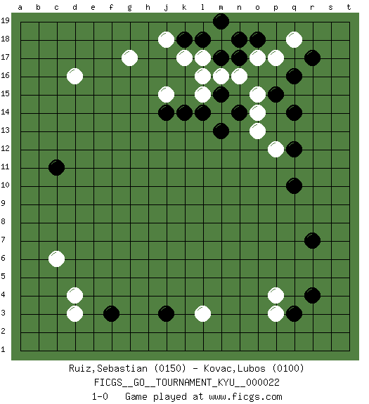 Last move : 1-0 2007 May 5 7:50:32 [Event "FICGS__GO__TOURNAMENT_KYU__000022 "] [Site "FICGS"] [Date "2007.02.14"] [Round "1"] [Black "Ruiz,Sebastian "] [White "Kovac,Lubos "] [Result "1-0"] [Rating 1 "0150"] [Rating 2 "0100"] 1.q16 d4 2.r4 d16 3.q10 p3 4.q3 p4 5.r7 o17 6.m17 o15 7.q14 o13 8.m15 l3 9.f3 c6 10.j3 k17 11.k14 g17 12.c11 p12 13.q12 q18 14.r17 m18 15.l18 l17 16.n18 m16 17.m19 d3 18.o18 p17 19.p15 j18 20.k18 l16 21.n17 n16 22.n14 o14 23.m13 j15 24.j14 l15 25.l14 1-0 This go game has been lost on time (started : 2007.02.14 12:52:41) Here are the names of the openings (joseki) played in the four corners : Corner q4 : r4 p3Komoku (Somok, Xiao~mu`) 3-4 Point. The komoku (3-4) point is the traditional corner enclosure move..Ikken Kakari (Hankan Keolch'im, Yi Gua`jiao~, 1-Space Low Pincer). The small knight move is the basic approach move to the 3-4 point stone. It has been continually used for over four centuries. There are limitless variations, with new moves constantly being discovered. White 2 opens the door to a treaure store of joseki. Corner q16 : q16 o17Hoshi (Hwajeom, Seongjeom, Xingwei`) 4-4 Point. The star or hoshi (4-4) point, emphasizing influence at the potential expense of territory.Ikken Kakari (Hankan Keolch'im, Yi Gua`jiao~, 1-Space Low Approach). White 2 is the standard approach move to the 4-4. Corner d4 : d4 f3Hoshi (Hwajeom, Seongjeom, Xingwei`) 4-4 Point. The star or hoshi (4-4) point, emphasizing influence at the potential expense of territory.Ikken Kakari (Hankan Keolch'im, Yi Gua`jiao~, 1-Space Low Approach). Black 2 is the standard approach move to the 4-4. Player Black won this Go (weiqi, baduk) game.Follow this game move after move (download ) Don't overlook the edge of the board. (Anonymous) To send light into the darkness of men's hearts - such is the duty of the artist. (Schumann)