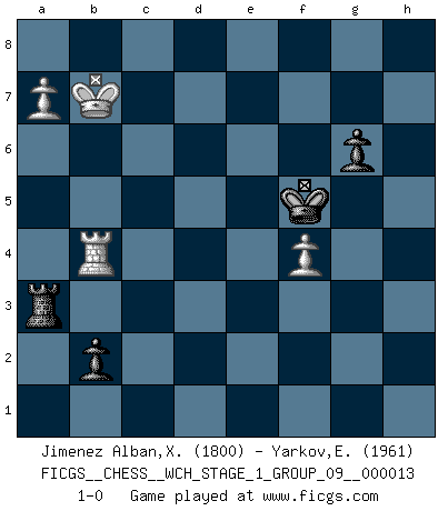 Last move : 1-0 2014 September 28 8:32:36 [Event "FICGS__CHESS__WCH_STAGE_1_GROUP_09__000013"] [Site "FICGS"] [Date "2014.03.24"] [Round "1"] [White "Jimenez Alban,Xavier Miguel"] [Black "Yarkov,Evgeny"] [Result "1-0"] [WhiteElo "1800"] [BlackElo "1961"] 1.e4 e5 2.Nf3 Nc6 3.Bb5 a6 4.Ba4 Nf6 5.O-O Be7 6.Re1 b5 7.Bb3 O-O 8.h3 Bb7 9.d3 d6 10.a3 Qd7 11.Nc3 Rae8 12.a4 b4 13.Nd5 Nxd5 14.Bxd5 Nd8 15.Bxb7 Nxb7 16.d4 exd4 17.Qxd4 a5 18.Qd5 Qc8 19.Bf4 Nc5 20.Be3 c6 21.Qc4 Qe6 22.Qxe6 Nxe6 23.Rad1 Ra8 24.Nd4 Nxd4 25.Bxd4 Rfd8 26.Bb6 Rd7 27.b3 g6 28.f4 Bh4 29.Re3 Rb7 30.Bd4 Rc8 31.g3 Be7 32.R3e1 f6 33.Bf2 Kf7 34.Kg2 d5 35.Rd2 Rd7 36.Red1 h5 37.g4 Rdc7 38.Kf3 hxg4+ 39.hxg4 Rh8 40.Re2 dxe4+ 41.Rxe4 Rh3+ 42.Bg3 f5 43.Re5 Bh4 44.Rg1 Re7 45.Rxa5 fxg4+ 46.Kxg4 Rxg3+ 47.Rxg3 Bxg3 48.Kxg3 Re3+ 49.Kg4 Rc3 50.Ra7+ Kf6 51.Rb7 c5 52.Rb6+ Kf7 53.a5 Rxc2 54.a6 Rg2+ 55.Kf3 Rb2 56.Ke4 Rxb3 57.Kd5 Ra3 58.Kxc5 b3 59.Kc6 Ke6 60.Kb7 Kf5 61.Rb4 b2 62.a7 1-0 This chess game has been lost on time (started : 2014.03.24 0:43:48) Ruy Lopez : Closed, 7...O-O Kingside Castling by player White (move 5) Kingside Castling by player Black (move 7) 10 pieces endgame at move 53 : White KRPPP , Black KRPPP WHITE : King + 1 Rook 3 Pawns BLACK : King + 1 Rook 3 Pawns 9 pieces endgame at move 56 : White KRPP , Black KRPPP WHITE : King + 1 Rook 2 Pawns BLACK : King + 1 Rook 3 Pawns 8 pieces endgame at move 58 : White KRPP , Black KRPP WHITE : King + 1 Rook 2 Pawns BLACK : King + 1 Rook 2 Pawns Player White won this chess game. Follow this game move after move (download)A good sacrifice is one that is not necessarily sound but leaves your opponent dazed and confused. (Rudolph Spielmann) Frage des Reporters: -Worin besteht das Ziel von Gambiteröffnungen? Antwort: -Auf Kosten der Partie einen Ruf als Angriffspieler zu erwerben.- (Siegbert Tarrasch) Después de la respuesta de las negras a 1.e4 con 1..e5, se quedan siempre tratando de entrar dentro del juego. (Howard Staunton) Pour se monter efficace, un Cavalier a besoin d'avant-postes ! Les Cavaliers font les meilleurs bloqueurs de pions passés. A good player is always lucky. (Capablanca)