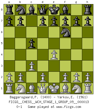 Last move : 0-1 2014 May 3 8:52:53 [Event "FICGS__CHESS__WCH_STAGE_1_GROUP_09__000013"] [Site "FICGS"] [Date "2014.03.03"] [Round "1"] [White "Baggersgaard,Poulerik"] [Black "Yarkov,Evgeny"] [Result "0-1"] [WhiteElo "1400"] [BlackElo "1961"] 1.e4 c5 2.c3 Nf6 0-1 This chess game has been lost on time (started : 2014.03.03 0:18:49) Sicilian : Alapin's variation (2.c3) Player Black won this chess game. Follow this game move after move (download)Bobby Fischer is the greatest Chess genius of all time ! (Alexander Kotov) Ich hatte Zahnschmerzen im ersten Spiel. In der zweiten Partie tat mir der Kopf weh. In der dritten war es eine Rheuma-Attacke und während der vierten fühlte ich mich nicht gut. Und in der fünften? Nun, man muss doch nicht jedes Spiel gewinnen, oder? (Savielly Grigorievitsch Tartakower) Si el Ajedrez es una ciencia, es la mas inexacta. Si el Ajedrez es un arte, es demasiado inexacto para ser visto como tal. Si el Ajedrez es un deporte, es demasiado esotérico. Si el Ajedrez es un juego, es demasiado exigente para ser solo un juego. Si el Ajedrez es una aventura, es una muy demandante. Si el Ajedrez es una pasión, es una muy gratificante. Si el Ajedrez es la vida, es una muy triste. (Anónimo) Donnez-moi un Cavalier en 6e et je gagnerais toutes mes parties. (Steinitz) The ego is not master in its own house. (Sigmund Freud)