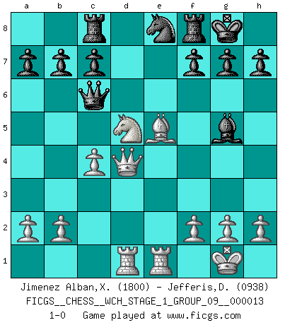 Last move : 1-0 2014 May 19 9:30:52 [Event "FICGS__CHESS__WCH_STAGE_1_GROUP_09__000013"] [Site "FICGS"] [Date "2014.03.24"] [Round "1"] [White "Jimenez Alban,Xavier Miguel"] [Black "Jefferis,Des"] [Result "1-0"] [WhiteElo "1800"] [BlackElo "0938"] 1.e4 e5 2.Nf3 Nc6 3.Bb5 d6 4.d4 exd4 5.Nxd4 Bd7 6.O-O Nxd4 7.Bxd7+ Qxd7 8.Qxd4 Nf6 9.Nc3 Be7 10.Rd1 O-O 11.e5 Ne8 12.Bf4 Qc6 13.Nd5 Bd8 14.Re1 dxe5 15.Bxe5 Rc8 16.Rad1 Bg5 17.c4 1-0 This chess game has been lost on time (started : 2014.03.24 0:43:48) Ruy Lopez : Old Steinitz defense Kingside Castling by player White (move 6) Kingside Castling by player Black (move 10) Player White won this chess game. Follow this game move after move (download)It is always better to sacrifice your opponent's men. (Savielly Tartakower) Ich bin der einzige Schachspieler, der sich während der Vorbereitungen zum Turnier verletzt hat. (Woody Allen) El Ajedrez es 99 por ciento táctica. (Teichmann) Le succès, c'est être capable d'aller d'échec en échec sans perdre son enthousiasme. (Winston Churchill) We're missing something. (Gregory House, House M.D.)