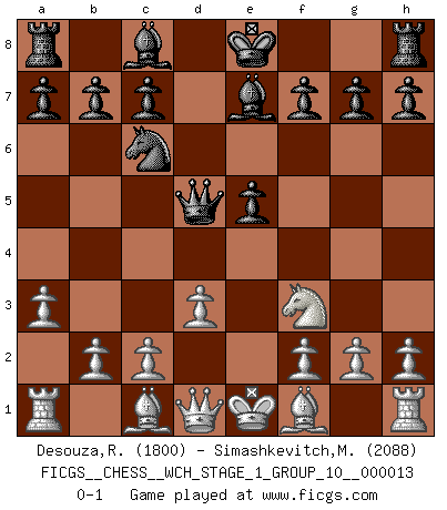 Last move : 0-1 2014 April 17 19:53:21 [Event "FICGS__CHESS__WCH_STAGE_1_GROUP_10__000013"] [Site "FICGS"] [Date "2014.03.03"] [Round "1"] [White "Desouza,Romeo"] [Black "Simashkevitch,Mykola"] [Result "0-1"] [WhiteElo "1800"] [BlackElo "2088"] 1.e4 e5 2.Nf3 Nc6 3.a3 Nf6 4.Nc3 d5 5.Nxd5 Nxd5 6.exd5 Qxd5 7.d3 Be7 0-1 This chess game has been lost on time (started : 2014.03.03 0:20:7) King's pawn game Player Black won this chess game. Follow this game move after move (download)The most powerful weapon in Chess is to have the next move. (David Bronstein) Das Zentrum ist der Balkan des Schachbretts - Kriegshandlungen können in jedem Moment ausbrechen. (Aaron Nimzowitsch) Aún el Rey más flojo huye despavorido ante la amenaza de un Jaque doble. (Aaron Nimzowitsch) Que feriez-vous si vous étiez en train de jouer aux échecs et que la fin du monde arrive ? Je continuerais à jouer. (Saint Borromée) Always remember that you are unique; just like everyone else. (Unknown)