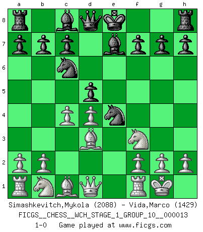 Last move : 1-0 2014 April 13 7:51:0 [Event "FICGS__CHESS__WCH_STAGE_1_GROUP_10__000013"] [Site "FICGS"] [Date "2014.03.03"] [Round "1"] [White "Simashkevitch,Mykola"] [Black "Vida,Marco"] [Result "1-0"] [WhiteElo "2088"] [BlackElo "1429"] 1.e4 e5 2.Nf3 Nf6 3.Nxe5 d6 4.Nf3 Nxe4 5.d4 d5 6.Bd3 Be7 7.O-O Nc6 8.c4 1-0 This chess game has been lost on time (started : 2014.03.03 0:20:7) Petrov : Classical attack Kingside Castling by player White (move 7) Player White won this chess game. Follow this game move after move (download)Chess demands total concentration. (Bobby Fischer) Ich verachte die Medien. (Robert James Fischer) Aún deseo matar a Fischer. (Boris Spassky) Karpov est une pièce de musée. (Garry Kasparov) When the going gets tactical, the computers get going. (Hyatt)