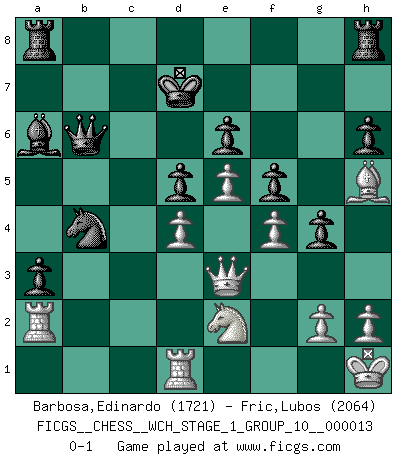 Last move : 0-1 2014 May 9 21:16:2 [Event "FICGS__CHESS__WCH_STAGE_1_GROUP_10__000013"] [Site "FICGS"] [Date "2014.03.03"] [Round "1"] [White "Barbosa,Edinardo"] [Black "Fric,Lubos"] [Result "0-1"] [WhiteElo "1721"] [BlackElo "2064"] 1.d4 d5 2.c4 c6 3.Nc3 Nf6 4.Nf3 e6 5.Bg5 h6 6.Bh4 dxc4 7.e4 g5 8.Bg3 b5 9.Be2 Bb7 10.e5 Nd5 11.O-O Nd7 12.Nxd5 cxd5 13.Ne1 Bg7 14.f4 Qb6 15.Kh1 f5 16.Bh5+ Kd8 17.Nf3 g4 18.Ng1 Bf8 19.Bh4+ Be7 20.Bxe7+ Kxe7 21.Ne2 Nb8 22.Qe1 Kd7 23.Qd2 Nc6 24.a3 a5 25.Rfc1 Ba6 26.Rc2 b4 27.Rd1 a4 28.Qe3 c3 29.axb4 cxb2 30.Rxb2 a3 31.Ra2 Nxb4 0-1 QGD Slav defense Kingside Castling by player White (move 11) Player Black won this chess game. Follow this game move after move (download)Becoming successful at Chess allows you to discover your own personality. That's what I want for the kids I teach. (Saudin Robovic) Die größte Kunst beim Schach besteht darin dem Gegner nicht zu zeigen was er tun kann. (Garry Kasparov) Una clavada es mas poderosa que una espada. (Fred Reinfeld) Il vaut toujours mieux jouer un plan faux de façon logique que de n'avoir pas de plan du tout. (Victor Kortchnoï) Unless in communicating with it one says exactly what one means, trouble is bound to result. (Alan Turing, about computers)