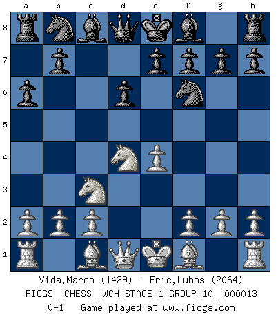 Last move : 0-1 2014 April 10 7:40:22 [Event "FICGS__CHESS__WCH_STAGE_1_GROUP_10__000013"] [Site "FICGS"] [Date "2014.03.03"] [Round "1"] [White "Vida,Marco"] [Black "Fric,Lubos"] [Result "0-1"] [WhiteElo "1429"] [BlackElo "2064"] 1.e4 c5 2.Nf3 d6 3.d4 cxd4 4.Nxd4 Nf6 5.Nc3 a6 0-1 This chess game has been lost on time (started : 2014.03.03 0:20:7) Sicilian : Najdorf Player Black won this chess game. Follow this game move after move (download)All my games are real. (Bobby Fischer) Ein Springer auf f6 gegen die eigene Rochadestellung ist schlimmer als ein rostiger Nagel im Knie. (Efim Bogoljubov) En el tablero, la mentira e hipocresía no sobreviven mucho. (Emanuel Lasker) On entre au jeu d'Echecs comme on entre en Religion. Pour le joueur d'Echecs, la partie d'Echecs c'est l'office, la messe, le défilé du 1er Mai, le dépôt de gerbe au Monument aux Morts. C'est un drame sacré. (Michel Roos) Computers are like Old Testament gods; lots of rules and no mercy. (Joseph Campbell)