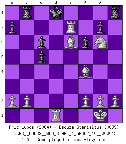 Last move : 1-0 2014 April 27 18:19:25 [Event "FICGS__CHESS__WCH_STAGE_1_GROUP_10__000013"] [Site "FICGS"] [Date "2014.03.03"] [Round "1"] [White "Fric,Lubos"] [Black "Dsouza,Stanislaus"] [Result "1-0"] [WhiteElo "2064"] [BlackElo "0895"] 1.d4 Nf6 2.c4 d5 3.cxd5 Nxd5 4.Nf3 Bf5 5.Qb3 b6 6.e4 Bxe4 7.Ne5 e6 8.Bb5+ Ke7 9.Nd2 Bg6 10.Bc6 Na6 11.O-O f6 12.Ndf3 Rb8 13.Re1 Nc5 14.Nxg6+ hxg6 15.dxc5 bxc5 16.Qxd5 Qxd5 17.Bxd5 e5 18.Bf4 Kd6 19.Rad1 c6 20.Nxe5 Be7 21.Nxg6 Kd7 22.Rxe7+ Kd8 23.Be6 1-0 Queen's pawn game Kingside Castling by player White (move 11) Player White won this chess game. Follow this game move after move (download)One of these modest little moves may be more embarrassing to your opponent than the biggest threat. (Siegbert Tarrasch) Wie ich sie so einen nach dem anderen nieder mähte wurde meine Überlegenheit offensichtlich. (José Raúl Capablanca) El juego de Damas es para vagabundos. (Paul Morphy) Je crois qu'il existe des manières très spécifiques de jouer efficacement contre une machine. Evidemment, nous n'avons aucune chance en technique pure, parce que l'ordinateur calcule de manière parfaite. Mais lorsque nous faisons appel à notre cerveau, en utilisant l'intuition et la compréhension, alors nous restons beaucoup plus forts. (Anatoli Karpov) Inventor: A person who makes an ingenious arrangement of wheels, levers and springs, and believes it civilization. (Ambrose Bierce, The Devil's Dictionary)