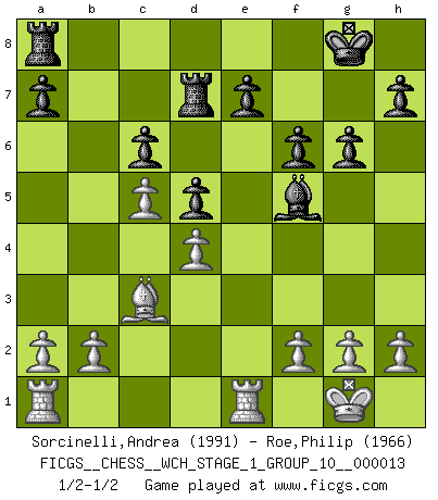 Last move : 1/2-1/2 2014 April 10 3:31:35 [Event "FICGS__CHESS__WCH_STAGE_1_GROUP_10__000013"] [Site "FICGS"] [Date "2014.03.03"] [Round "1"] [White "Sorcinelli,Andrea"] [Black "Roe,Philip"] [Result "1/2-1/2"] [WhiteElo "1991"] [BlackElo "1966"] 1.e4 c6 2.d4 d5 3.exd5 cxd5 4.c4 Nf6 5.Nc3 Be6 6.c5 g6 7.Nf3 Bg7 8.Qb3 Qc8 9.Bb5+ Nc6 10.O-O O-O 11.Re1 Rd8 12.Qa4 Ne4 13.Bf4 Bg4 14.Bxc6 Qxc6 15.Qxc6 bxc6 16.Ne5 Bxe5 17.Bxe5 f6 18.Bc7 Rd7 19.Ba5 Nxc3 20.Bxc3 Bf5 1/2-1/2 Caro-Kann : Panov-Botvinnik attack Kingside Castling by player White (move 10) Kingside Castling by player Black (move 10) This chess game ended in a draw. Follow this game move after move (download)Chess is above all, a fight ! (Emanuel Lasker) Im Hotelzimmer gab es nur zwei Schaben. (Über die Turnierbedingungen) (Peter Swidler) Entre mas años cumplo, mas valoro los Peones. (Keres) Ce n'est pas pour s'amuser qu'il joue aux échecs : il célèbre un culte. (Vladimir Nabokov) I believe in luck. How else can you explain the success of those you dislike ? (Jean Cocteau)