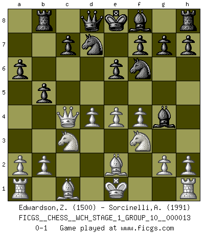 Last move : 0-1 2014 May 16 9:21:37 [Event "FICGS__CHESS__WCH_STAGE_1_GROUP_10__000013"] [Site "FICGS"] [Date "2014.03.03"] [Round "1"] [White "Edwardson,Zachariah"] [Black "Sorcinelli,Andrea"] [Result "0-1"] [WhiteElo "1500"] [BlackElo "1991"] 1.f4 d6 2.Nf3 Bg4 3.e3 Nd7 4.Be2 d5 5.c4 e6 6.d4 Ngf6 7.Qb3 Rb8 8.Nc3 dxc4 9.Qxc4 a6 10.e4 b5 0-1 This chess game has been lost on time (started : 2014.03.03 0:20:7) Bird's Opening Player Black won this chess game. Follow this game move after move (download)My style is somewhere between that of Tal and Petrosian. (Reshevsky) Charakterschwächen offenbaren sich normalerweise während einer Schachpartie. (Garry Kasparov) Debes de llevar a tu oponente hacia un profundo y obscuro bosque donde 2+2=5, y el camino que conduce a la salida es suficientemente ancho para solamente uno. (Mikhail Tal) Fischer est le meilleur joueur du monde et Karpov n'est qu'un joueur de bistrot. (Garry Kasparov, agé de 16 ans) Knowledge rests not upon truth alone, but upon error also. (Carl G. Jung)