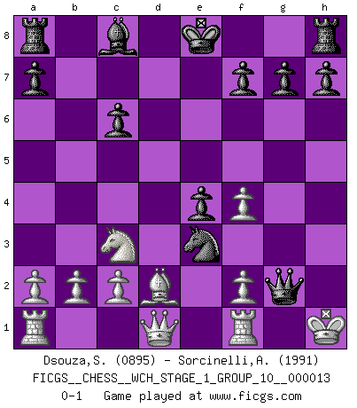 Last move : 0-1 2014 May 4 13:32:9 [Event "FICGS__CHESS__WCH_STAGE_1_GROUP_10__000013"] [Site "FICGS"] [Date "2014.03.03"] [Round "1"] [White "Dsouza,Stanislaus"] [Black "Sorcinelli,Andrea"] [Result "0-1"] [WhiteElo "0895"] [BlackElo "1991"] 1.Nf3 c5 2.d4 cxd4 3.Qxd4 Nc6 4.Qd1 Nf6 5.Nc3 d5 6.e3 e5 7.Bb5 Bd6 8.O-O e4 9.Nd2 Bxh2+ 10.Kh1 Ng4 11.g3 Qg5 12.Ndxe4 dxe4 13.Bxc6+ bxc6 14.Bd2 Bxg3 15.Kg2 Bf4 16.exf4 Ne3+ 17.Kh1 Qg2+ 0-1 Reti Opening Kingside Castling by player White (move 8) Player Black won this chess game. Follow this game move after move (download)I look one move ahead... the best ! (Siegbert Tarrasch) Lisa Lane, amerikanische Schachmeisterin, hatte Fischer einmal als stärksten lebenden Spieler bezeichnet. Antwort: Das ist richtig, aber Lisa Lane ist eigentlich nicht in der Lage, das zu beurteilen. (Robert James Fischer) Muchos jugadores de Ajedrez se sorprendían cuando después de la partida, Fischer explicaba con calma: 'Yo ya había analizado esta posibilidad' en una posición en la cual yo creía que no era posible de prever desde la apertura. (Mikhail Tal) Roi des jeux et jeu des rois, les échecs portent en eux un sentiment d'infini. Ils donnent à celui qui s'est efforcé d'en approfondir les arcanes l'impression de n'être pas à la mesure de l'homme; en fait, ils constituent un résumé de l'univers, un microcosme, et figurent cette grande échelle qui, dans les plans de la lumière descend jusqu'à la matière, qui des abîmes insondables remonte jusqu'en l'infini de Dieu. (Pyrame) You must have a dream in order to have it come true. (A.P.J. Kalam)